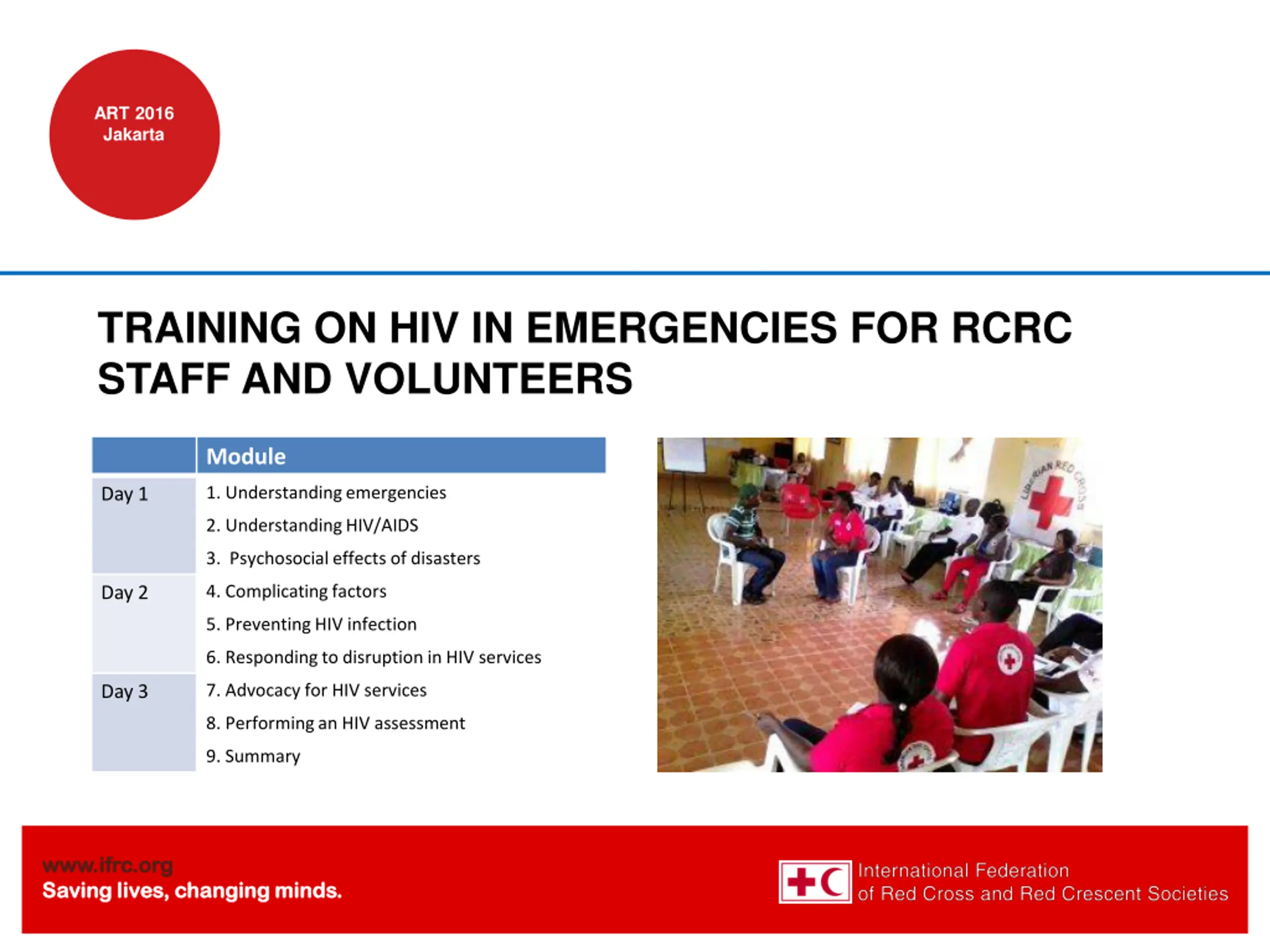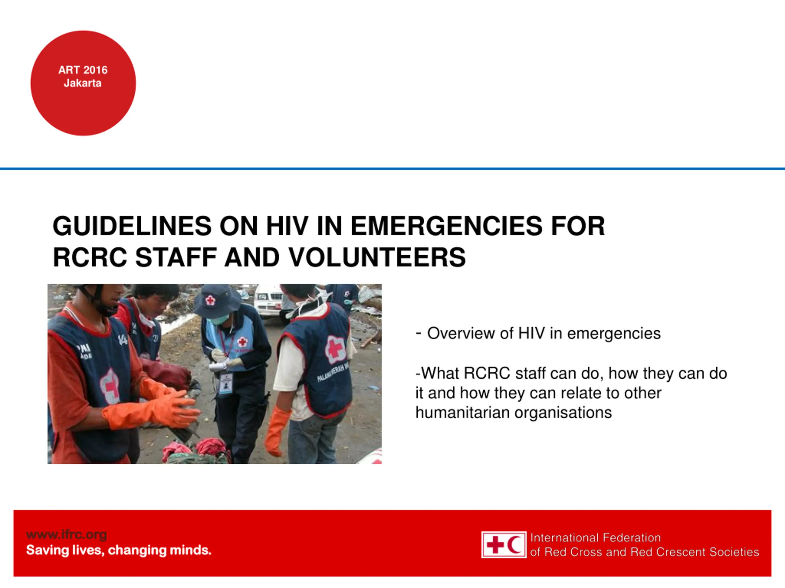 ART 2016 Jakarta GUIDELINES ON HIV IN EMERGENCIES FOR RCRC STAFF AND VOLUNTEERS - Overview of HIV in emergencies -What RCRC staff can do, how they can do it and how they can relate to other humanitarian organisations www.ifrc.org www.ifrc.org Saving lives, changing minds. Saving lives, changing minds.