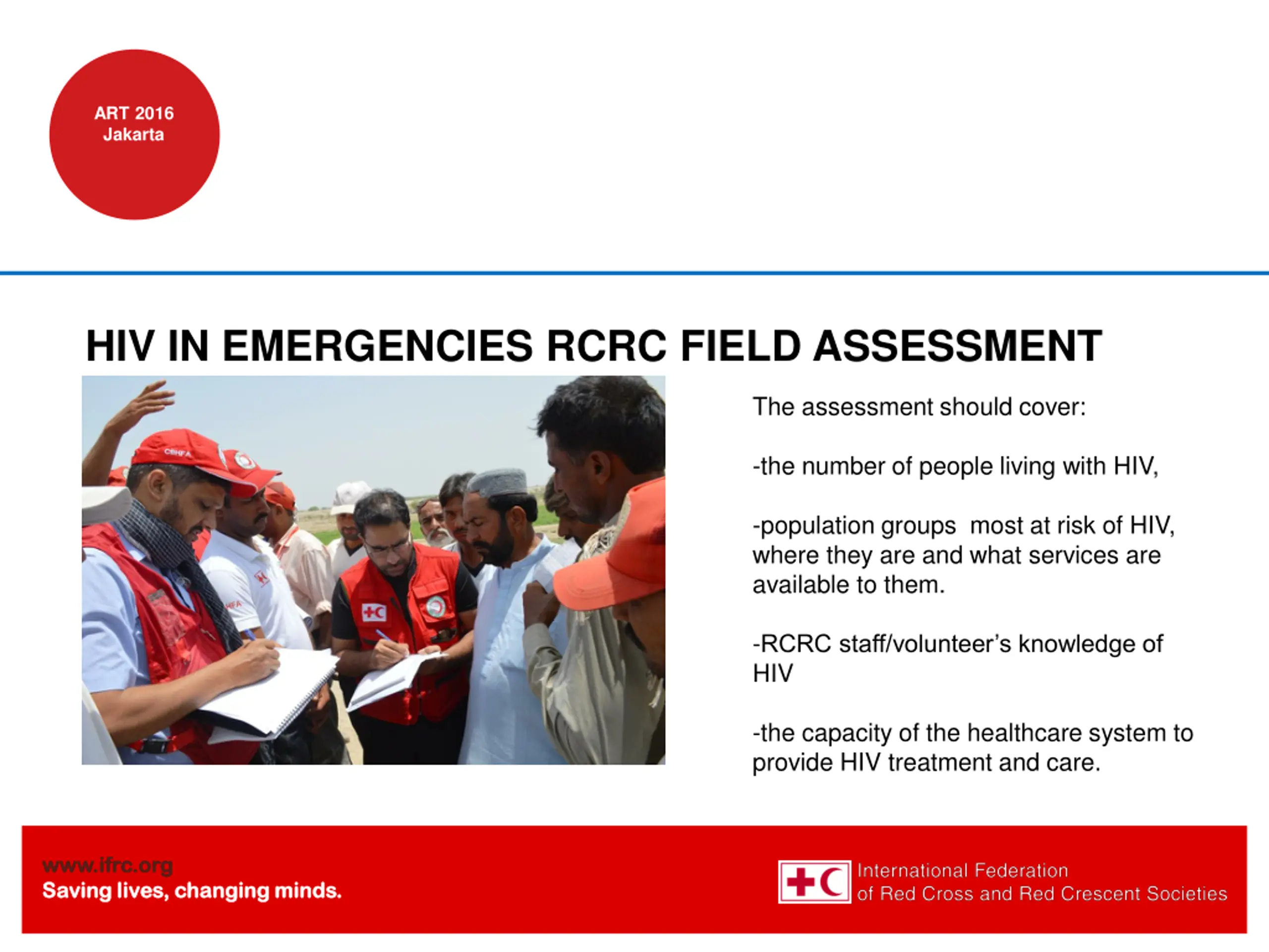 ART 2016 Jakarta HIV IN EMERGENCIES RCRC FIELD ASSESSMENT TOOL The assessment should cover: -the number of people living with HIV, -population groups most at risk of HIV, where they are and what services are available to them. -RCRC staff/volunteer s knowledge of HIV -the capacity of the healthcare system to provide HIV treatment and care. www.ifrc.org www.ifrc.org Saving lives, changing minds. Saving lives, changing minds.