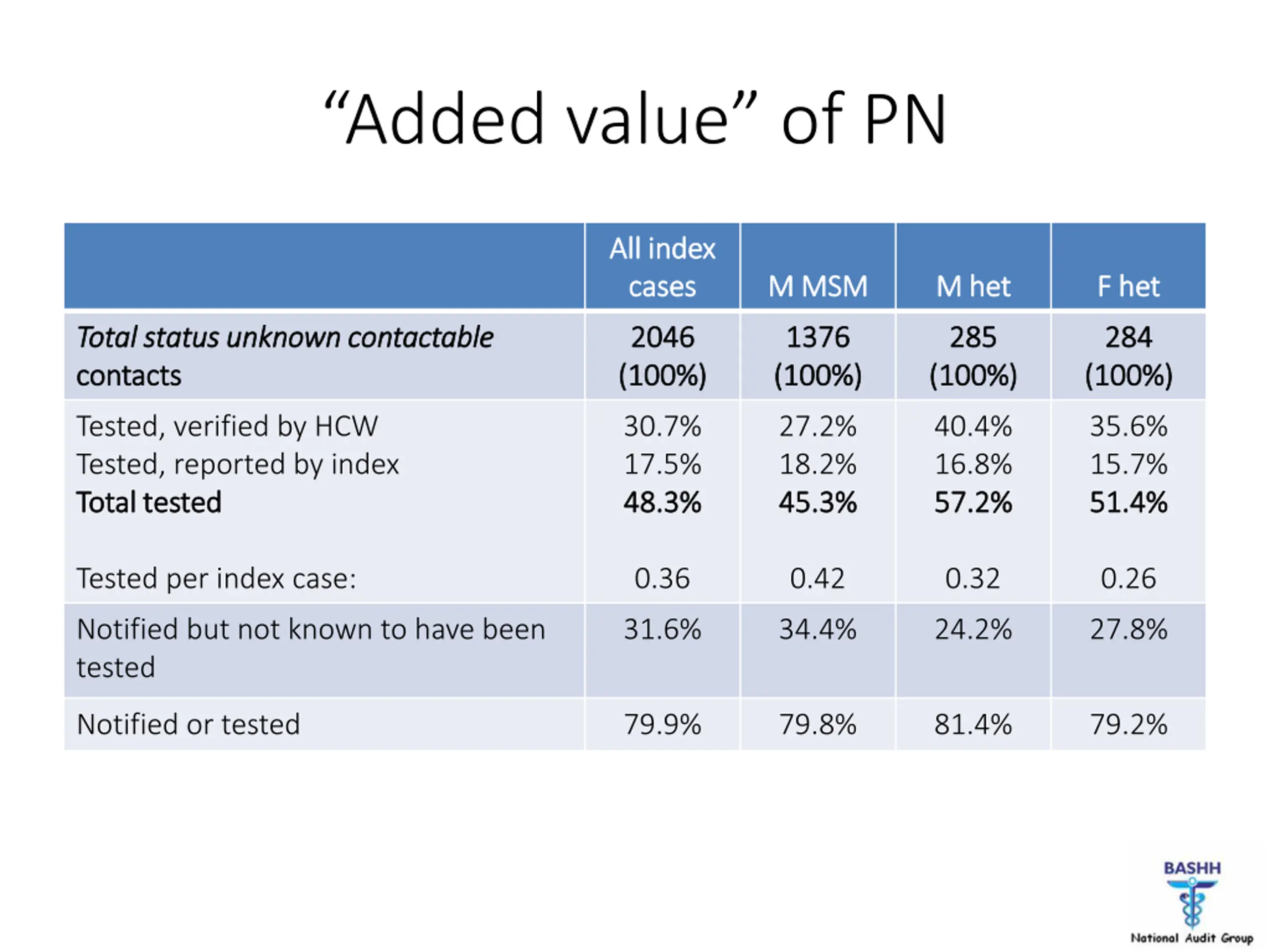 Added value of PN All index All index cases cases M MSM M MSM M het M het F het F het Total status unknown contactable Total status unknown contactable contacts contacts 2046 2046 (100%) (100%) 1376 1376 (100%) (100%) 285 285 (100%) (100%) 284 284 (100%) (100%) Tested, verified by HCW Tested, reported by index Total tested Total tested 30.7% 17.5% 48.3% 48.3% 27.2% 18.2% 45.3% 45.3% 40.4% 16.8% 57.2% 57.2% 35.6% 15.7% 51.4% 51.4% Tested per index case: 0.36 0.42 0.32 0.26 Notified but not known to have been tested 31.6% 34.4% 24.2% 27.8% Notified or tested 79.9% 79.8% 81.4% 79.2%