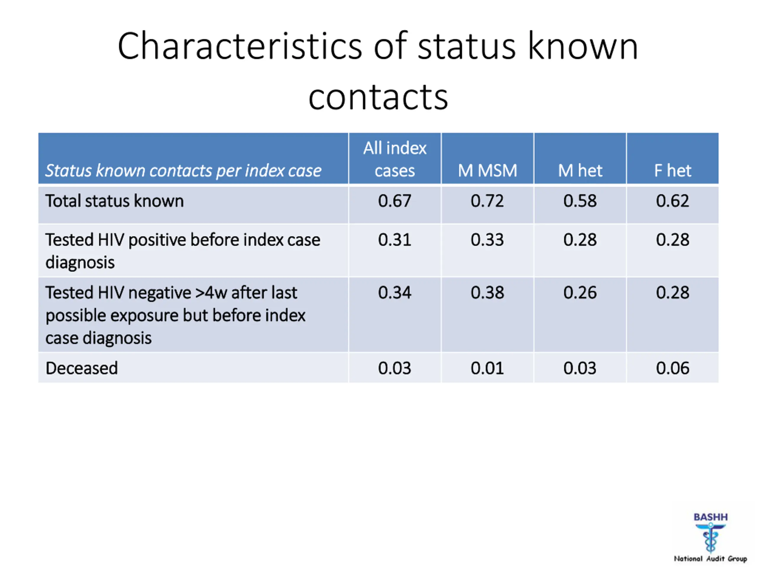 Background: Standards HIV Partner Notification for Adults: Definitions, Outcomes and Standards (NAT, BASHH, SSHA, BHIVA 2015) defines contacts as: Status Status known: known: known positive, known negative (test 4w+ post last exposure), or deceased Status Status unknown contactable: unknown contactable: means of contact available, or able to be found via past service attendance Status Status unknown uncontactable: unknown uncontactable: no means of contact