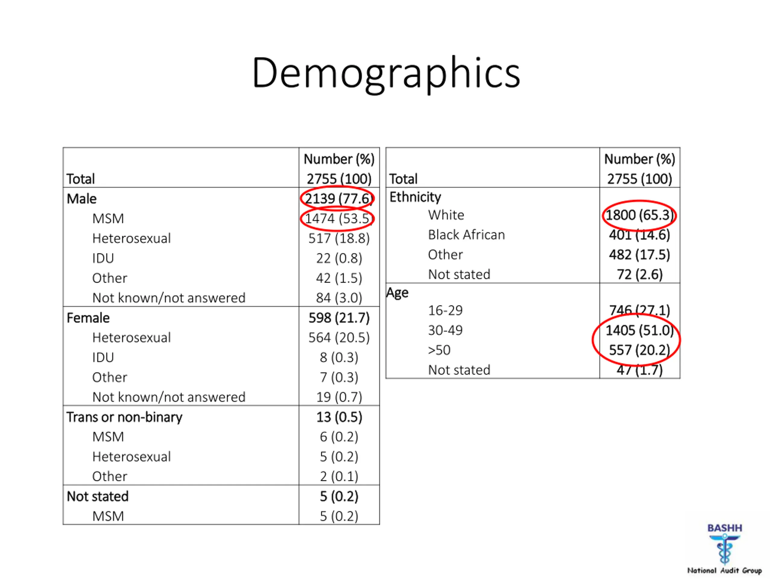 Demographics Number (%) Number (%) 2755 (100) 2755 (100) 2139 (77.6) 2139 (77.6) 1474 (53.5) 517 (18.8) 22 (0.8) 42 (1.5) 84 (3.0) 598 (21.7) 598 (21.7) 564 (20.5) 8 (0.3) 7 (0.3) 19 (0.7) 13 (0.5) 13 (0.5) 6 (0.2) 5 (0.2) 2 (0.1) 5 (0.2) 5 (0.2) 5 (0.2) Number (%) Number (%) 2755 (100) 2755 (100) Total Total Male Male Total Total Ethnicity Ethnicity White Black African Other Not stated 1800 (65.3) 1800 (65.3) 401 (14.6) 401 (14.6) 482 (17.5) 482 (17.5) 72 (2.6) 72 (2.6) MSM Heterosexual IDU Other Not known/not answered Female Female Heterosexual IDU Other Not known/not answered Trans or non Trans or non- -binary binary MSM Heterosexual Other Not stated Not stated MSM Age Age 16-29 30-49 >50 Not stated 746 (27.1) 746 (27.1) 1405 (51.0) 1405 (51.0) 557 (20.2) 557 (20.2) 47 (1.7) 47 (1.7)