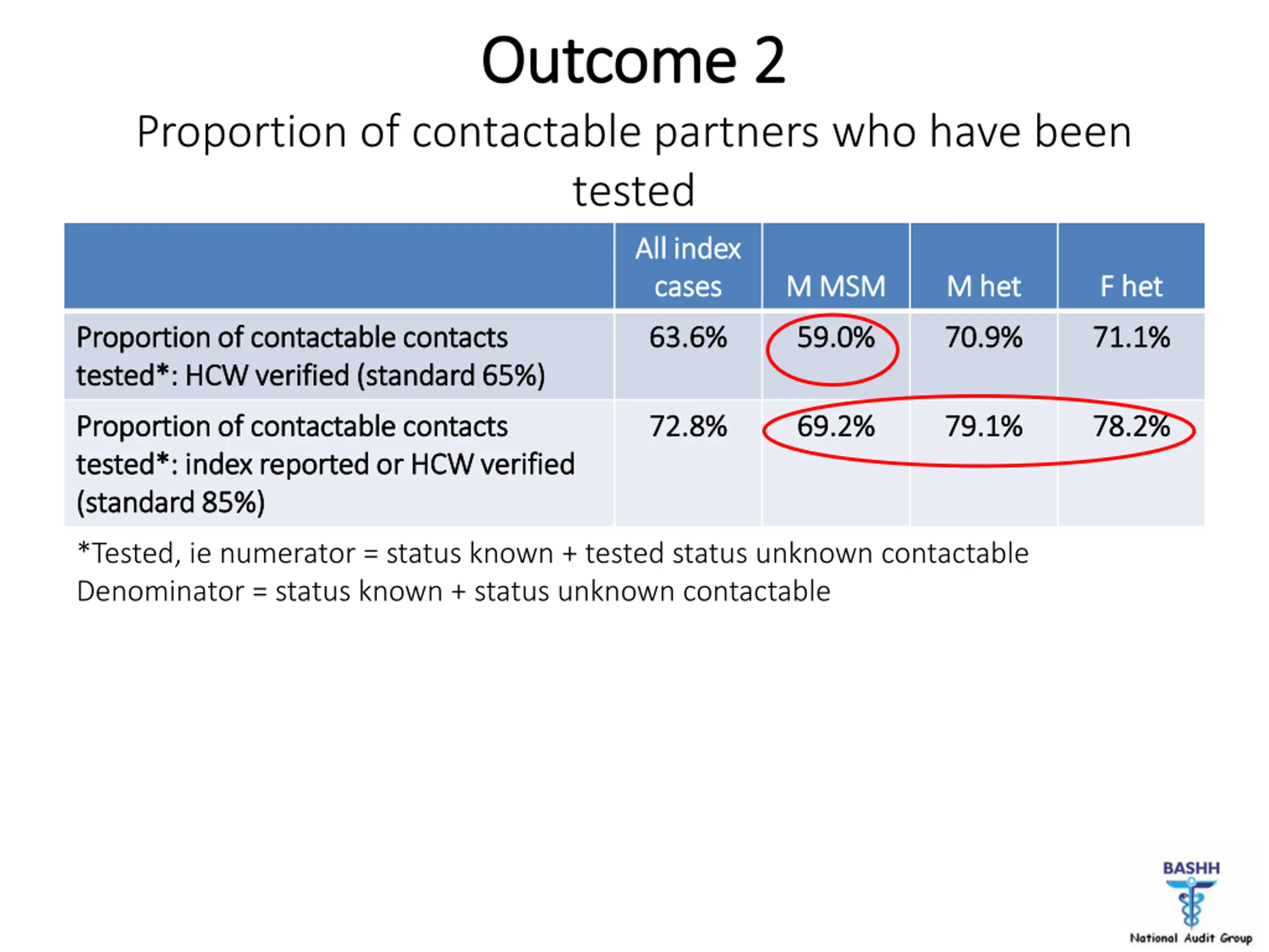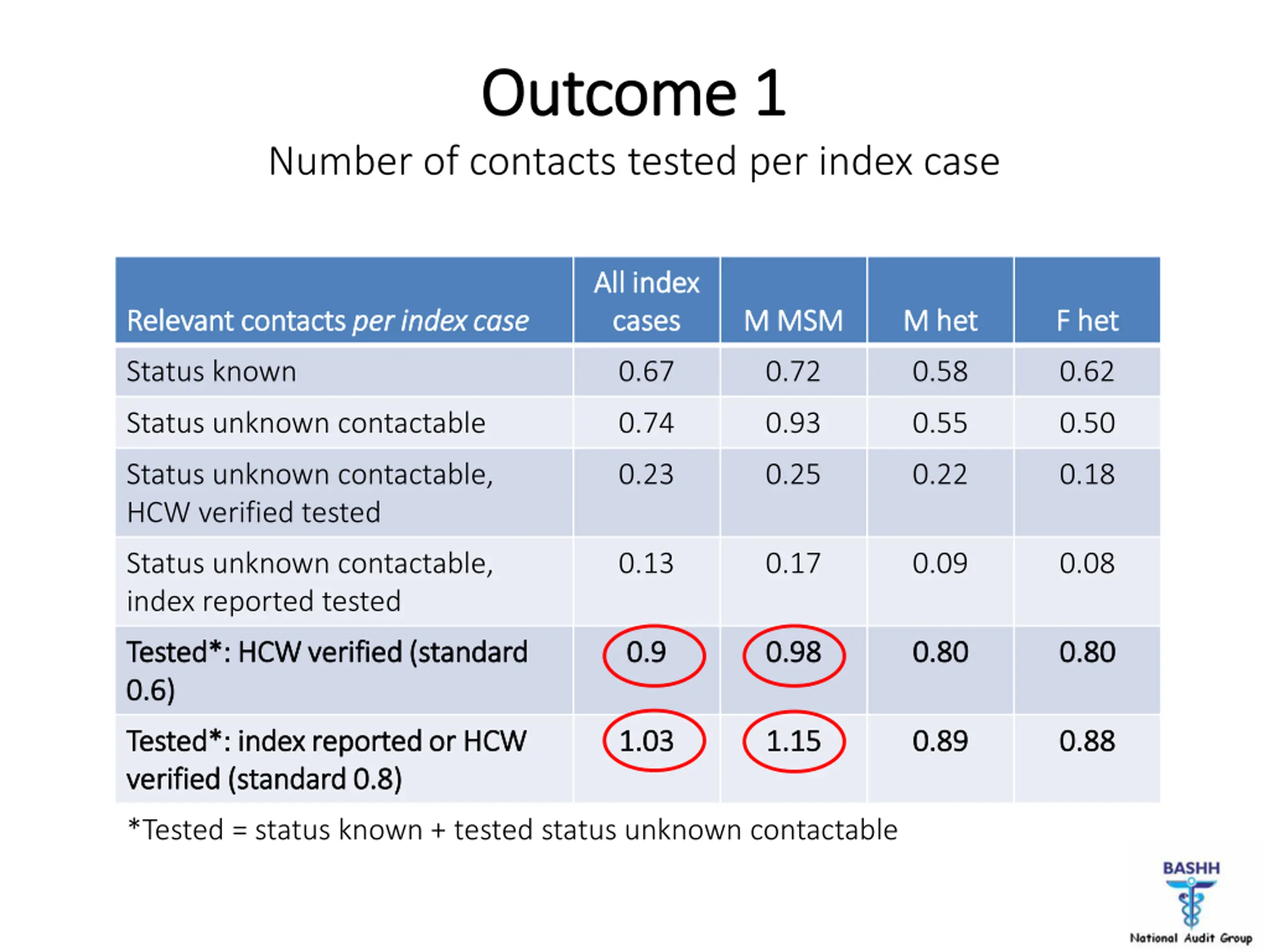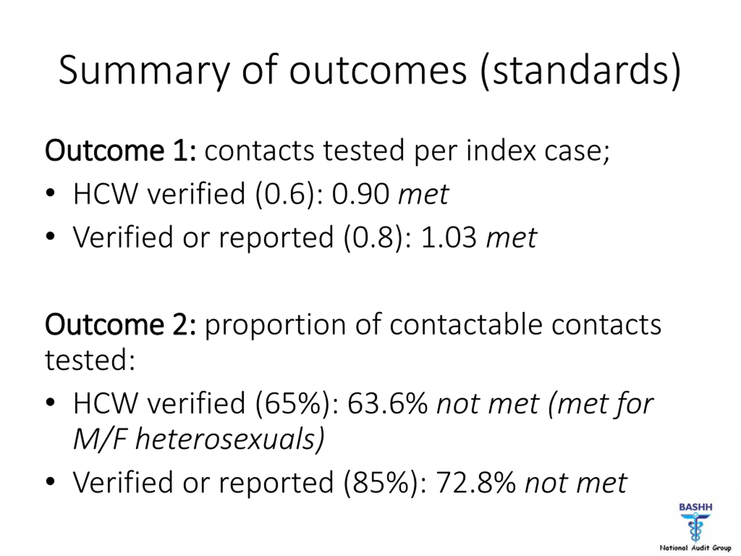 Summary of outcomes (standards) Outcome 1: Outcome 1: contacts tested per index case; HCW verified (0.6): 0.90 met Verified or reported (0.8): 1.03 met Outcome 2: Outcome 2: proportion of contactable contacts tested: HCW verified (65%): 63.6% not met (met for M/F heterosexuals) Verified or reported (85%): 72.8% not met