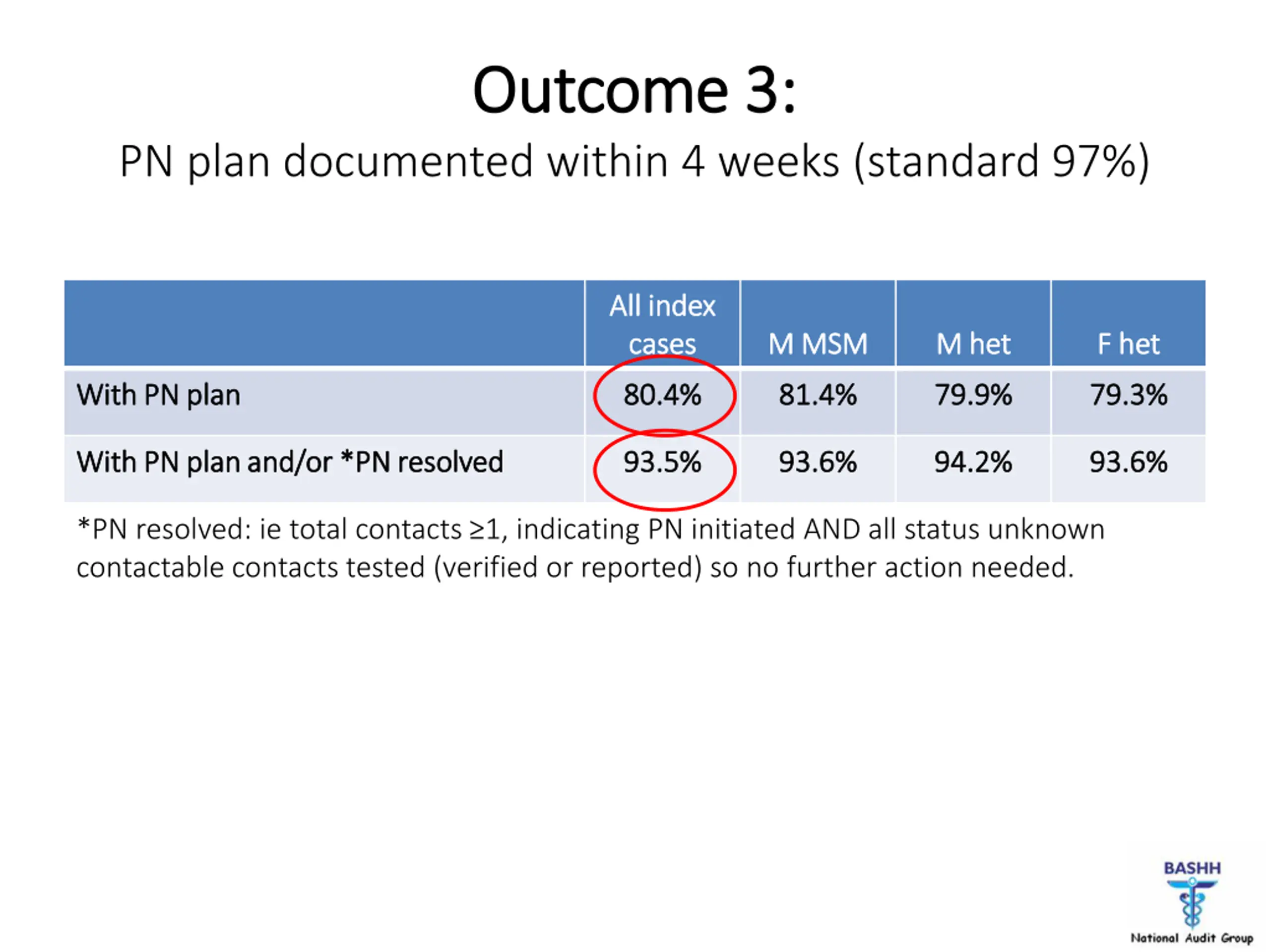 Outcome 3: Outcome 3: PN plan documented within 4 weeks (standard 97%) All index All index cases cases M MSM M MSM M het M het F het F het With PN plan With PN plan 80.4% 80.4% 81.4% 81.4% 79.9% 79.9% 79.3% 79.3% With PN plan and/or With PN plan and/or *PN resolved *PN resolved 93.5% 93.5% 93.6% 93.6% 94.2% 94.2% 93.6% 93.6% *PN resolved: ie total contacts 1, indicating PN initiated AND all status unknown contactable contacts tested (verified or reported) so no further action needed.