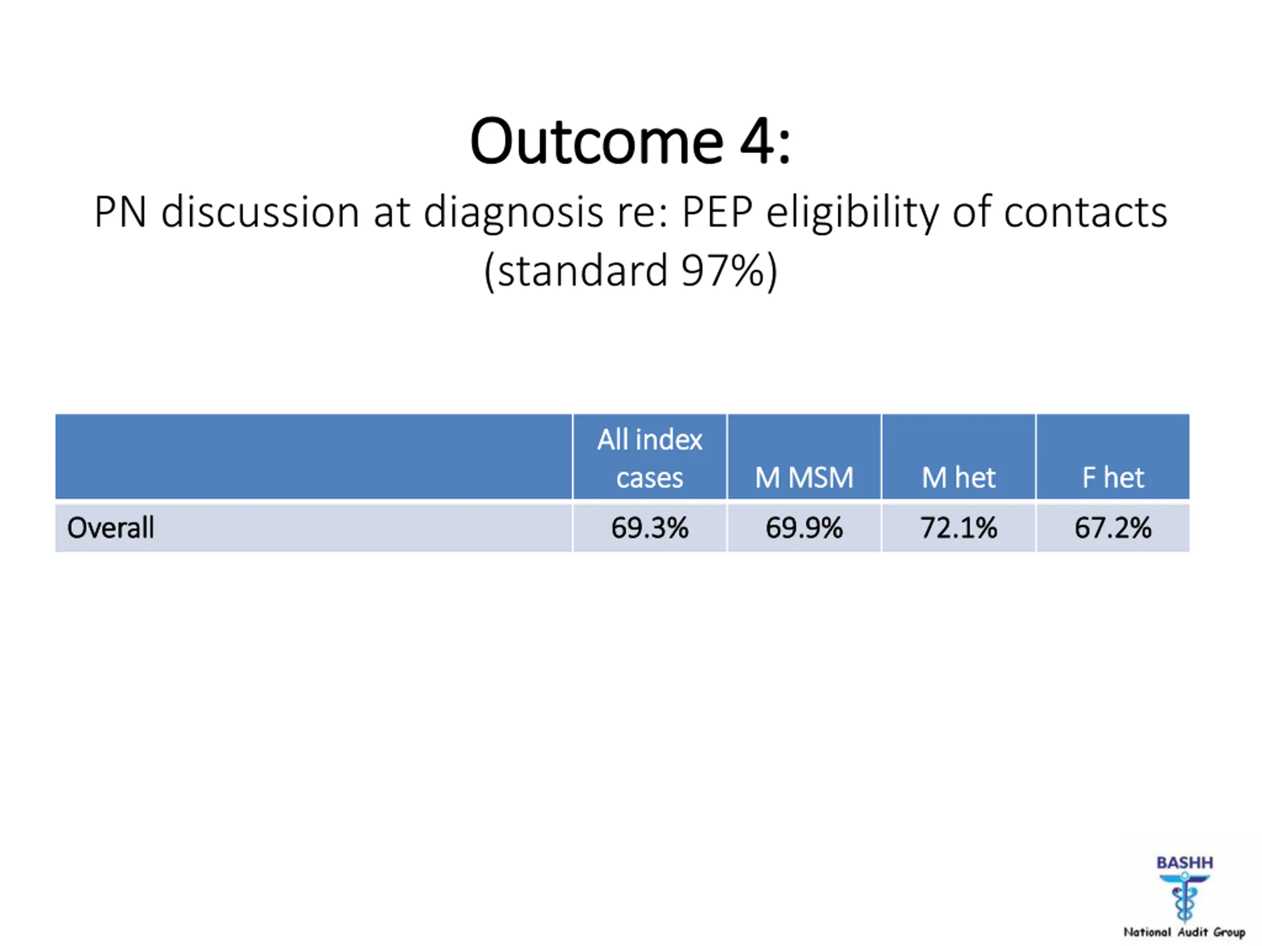 Standards: Outcomes 3 & 4 Outcome 3: Outcome 3: Index cases with a documented PN plan within 4 weeks of diagnosis: Standard: 97% Standard: 97% Outcome 4: Outcome 4: Index cases with documented PN discussion at diagnosis to identify risk contact within previous 72 hours and refer partners potentially eligible for PEP: Standard: 97% Standard: 97%