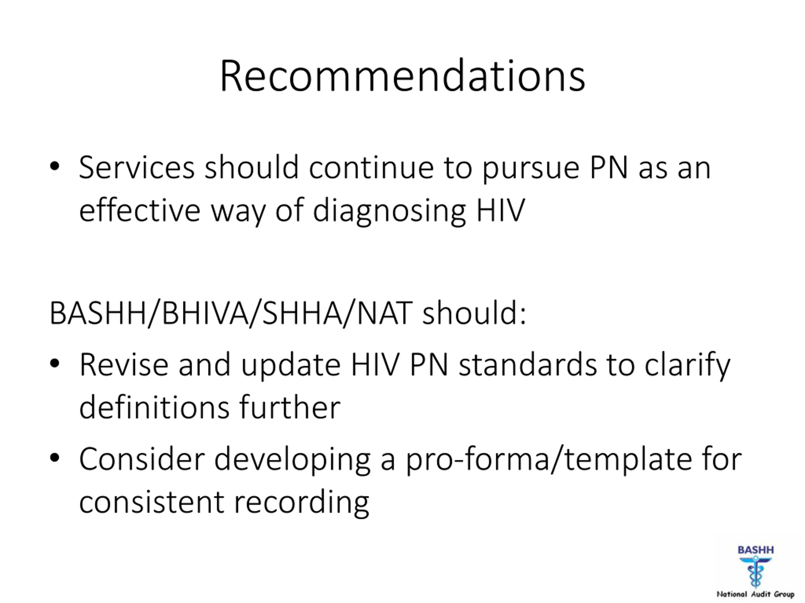 Recommendations Services should continue to pursue PN as an effective way of diagnosing HIV BASHH/BHIVA/SHHA/NAT should: Revise and update HIV PN standards to clarify definitions further Consider developing a pro-forma/template for consistent recording