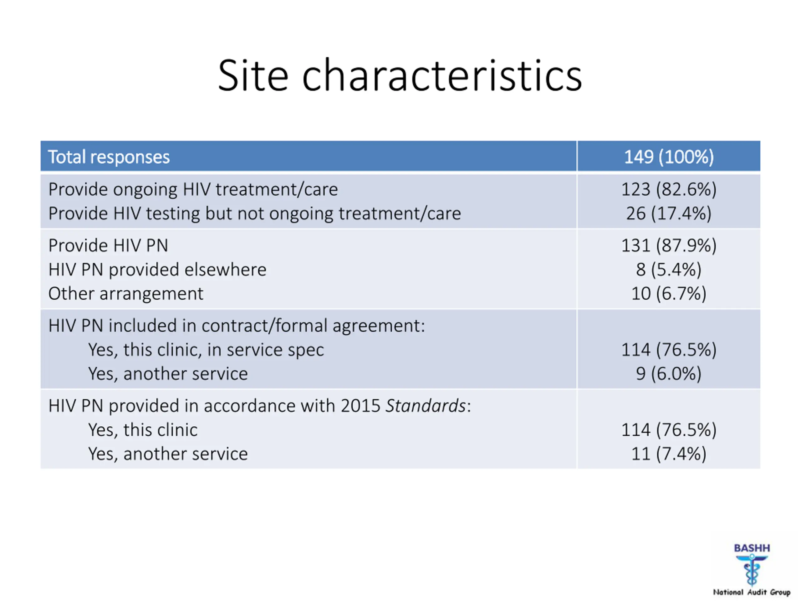 Site characteristics Total responses Total responses 149 (100%) 149 (100%) Provide ongoing HIV treatment/care Provide HIV testing but not ongoing treatment/care 123 (82.6%) 26 (17.4%) Provide HIV PN HIV PN provided elsewhere Other arrangement 131 (87.9%) 8 (5.4%) 10 (6.7%) HIV PN included in contract/formal agreement: Yes, this clinic, in service spec Yes, another service 114 (76.5%) 9 (6.0%) HIV PN provided in accordance with 2015 Standards: Yes, this clinic Yes, another service 114 (76.5%) 11 (7.4%)