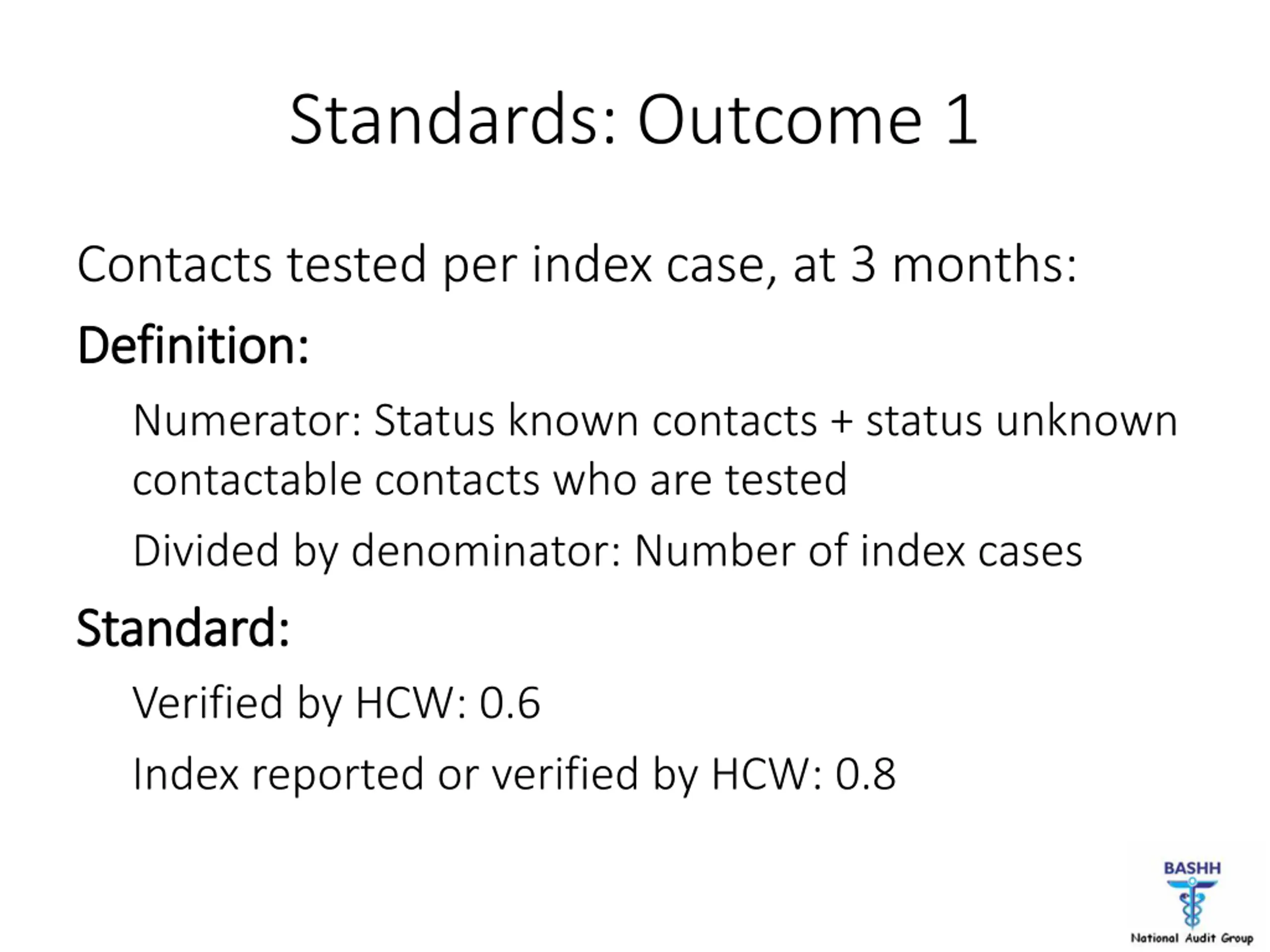 Standards: Outcome 1 Contacts tested per index case, at 3 months: Definition: Definition: Numerator: Status known contacts + status unknown contactable contacts who are tested Divided by denominator: Number of index cases Standard: Standard: Verified by HCW: 0.6 Index reported or verified by HCW: 0.8