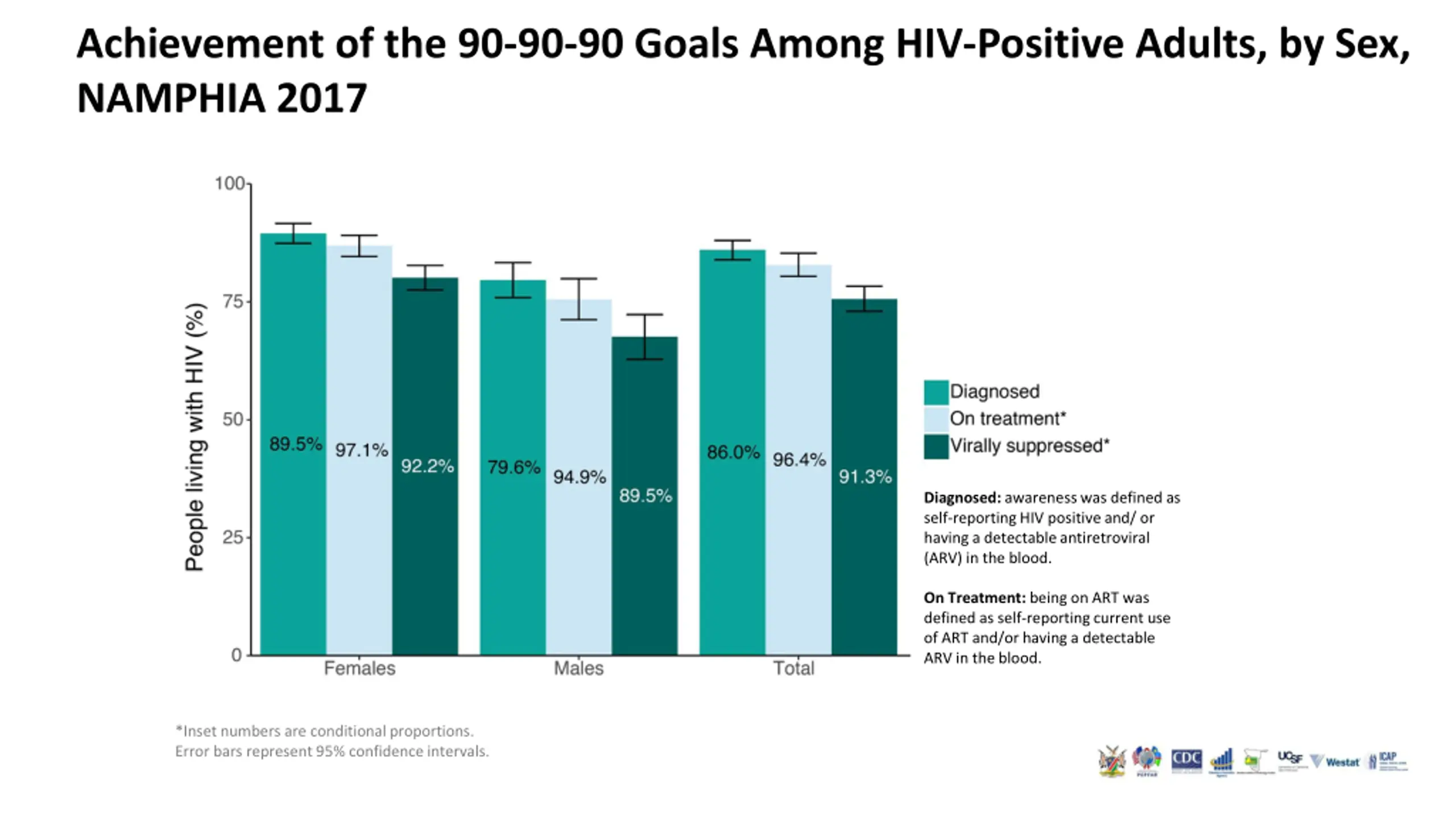 Achievement of the 90-90-90 Goals Among HIV-Positive Adults, by Sex, NAMPHIA 2017 Diagnosed: awareness was defined as self-reporting HIV positive and/ or having a detectable antiretroviral (ARV) in the blood. On Treatment: being on ART was defined as self-reporting current use of ART and/or having a detectable ARV in the blood. *Inset numbers are conditional proportions. Error bars represent 95% confidence intervals.