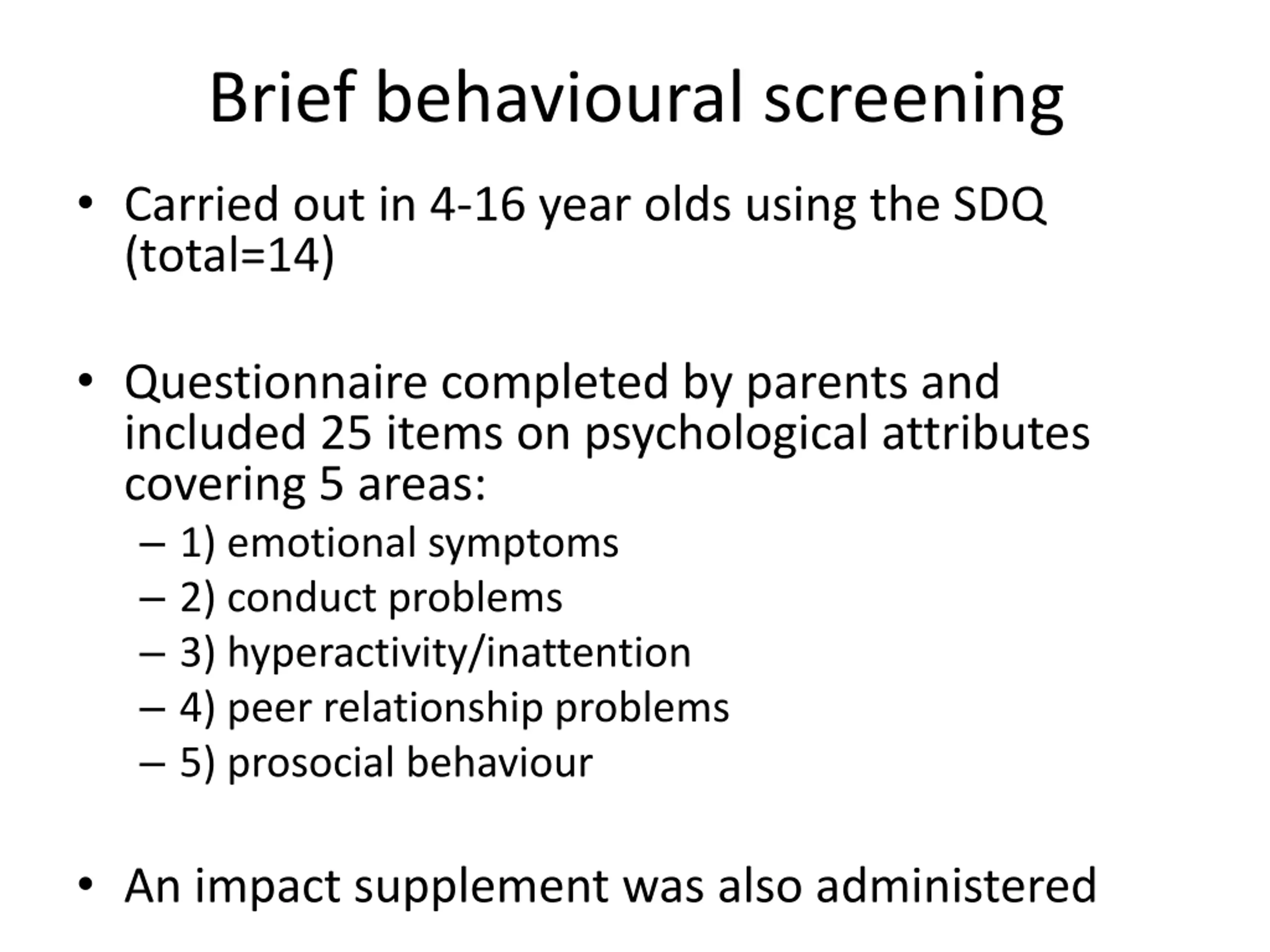 Brief behavioural screening Carried out in 4-16 year olds using the SDQ (total=14) Questionnaire completed by parents and included 25 items on psychological attributes covering 5 areas: 1) emotional symptoms 2) conduct problems 3) hyperactivity/inattention 4) peer relationship problems 5) prosocial behaviour An impact supplement was also administered