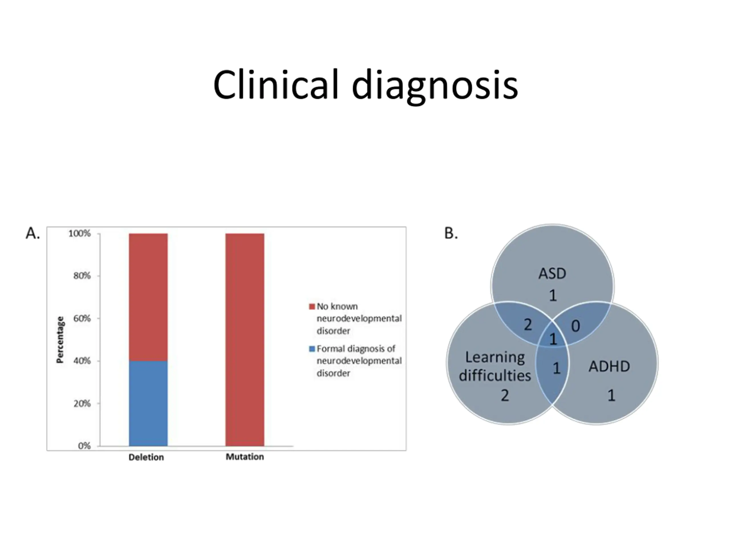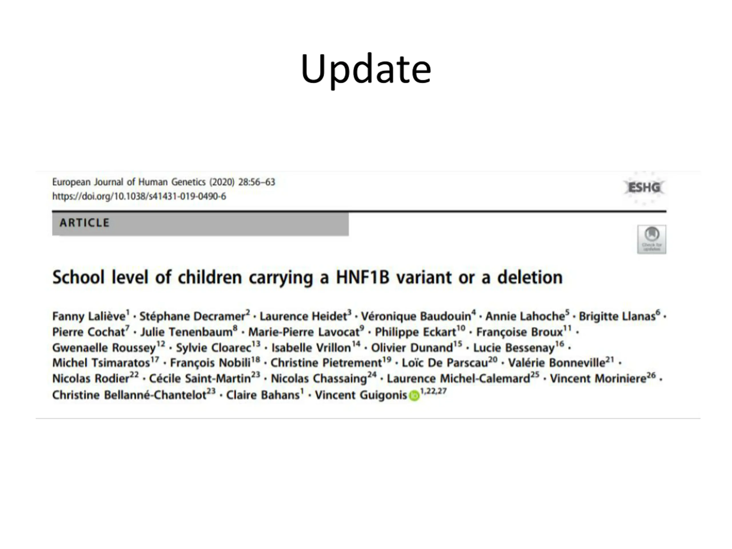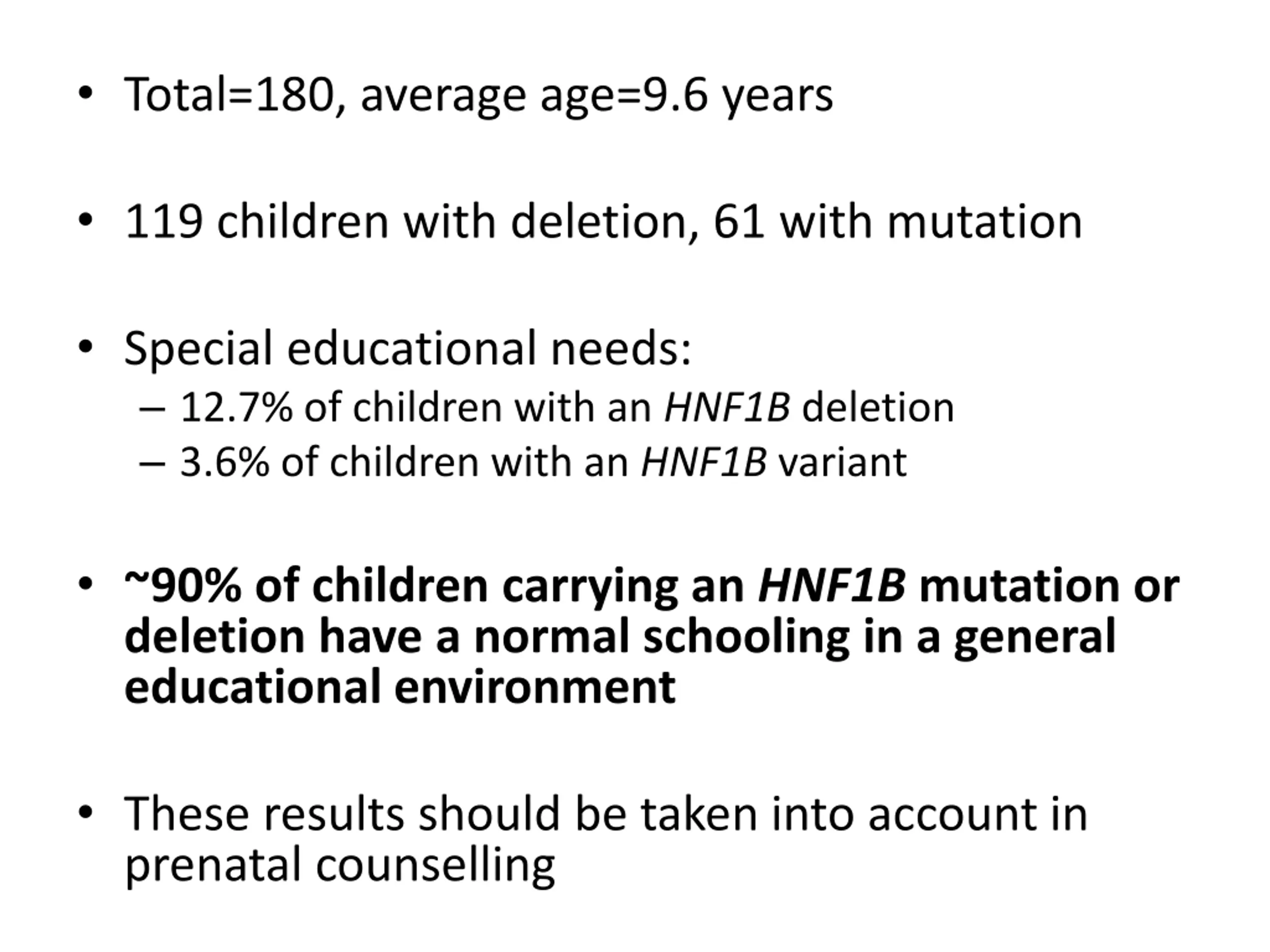 Total=180, average age=9.6 years 119 children with deletion, 61 with mutation Special educational needs: 12.7% of children with an HNF1B deletion 3.6% of children with an HNF1B variant ~90% of children carrying an HNF1B mutation or deletion have a normal schooling in a general educational environment These results should be taken into account in prenatal counselling