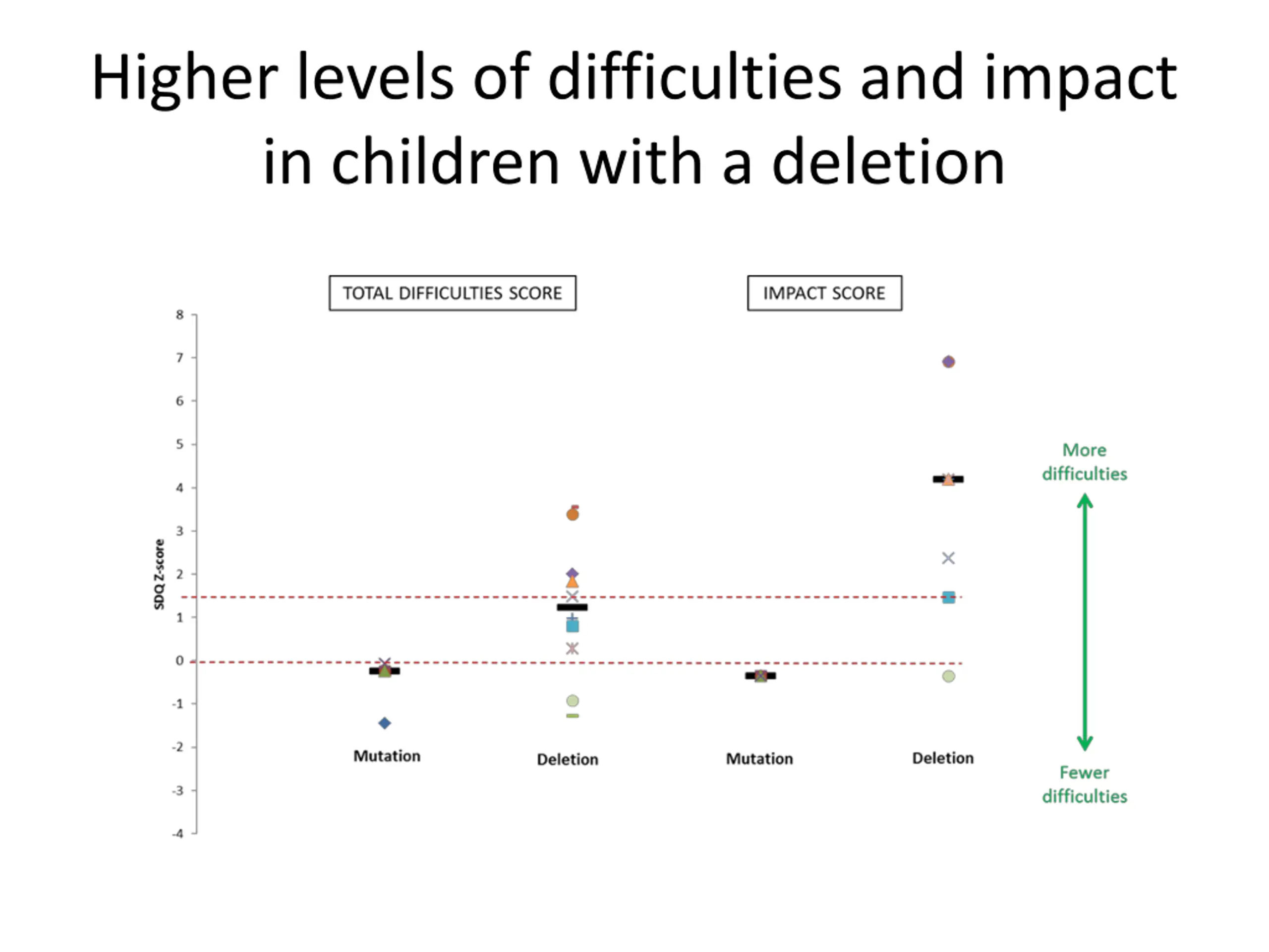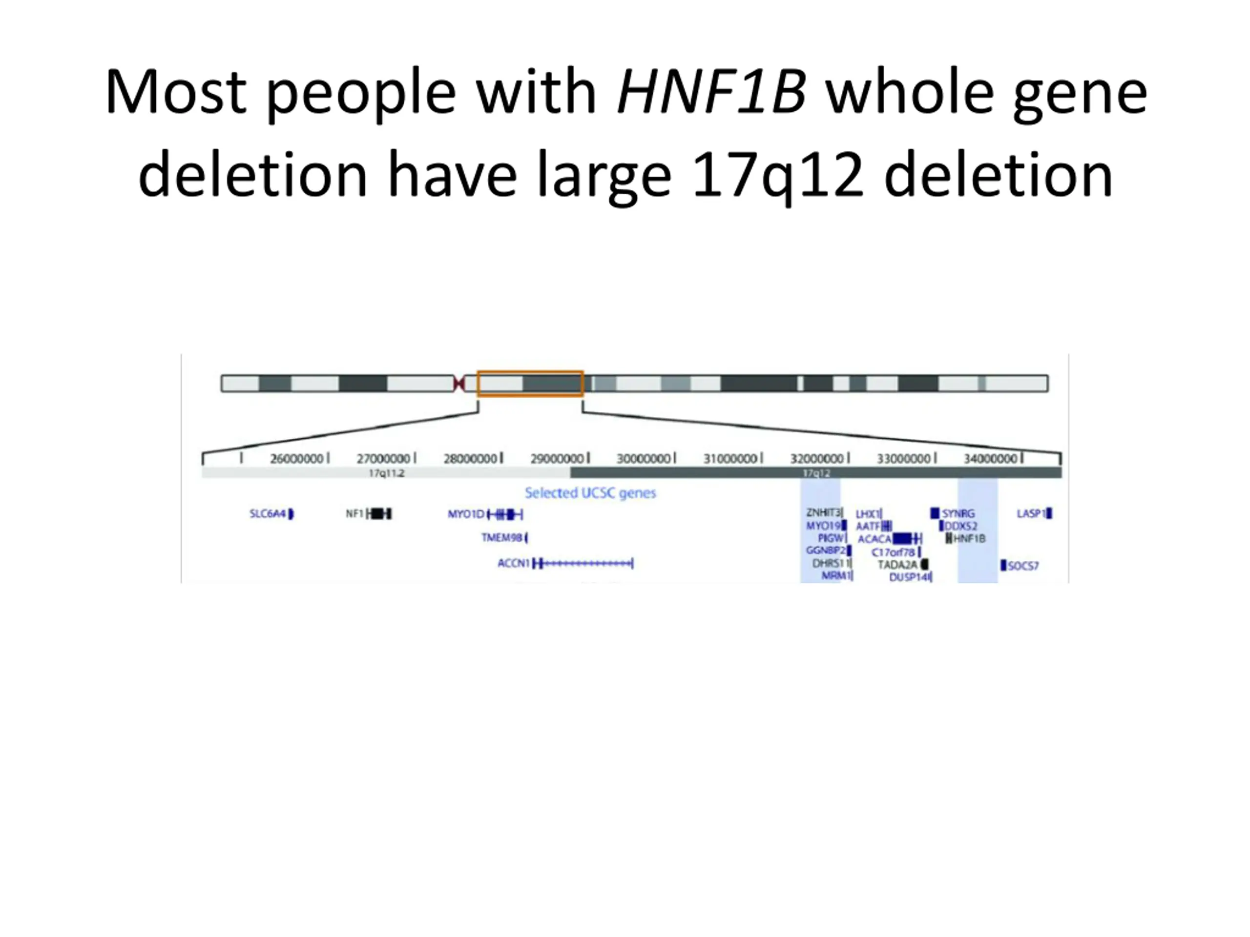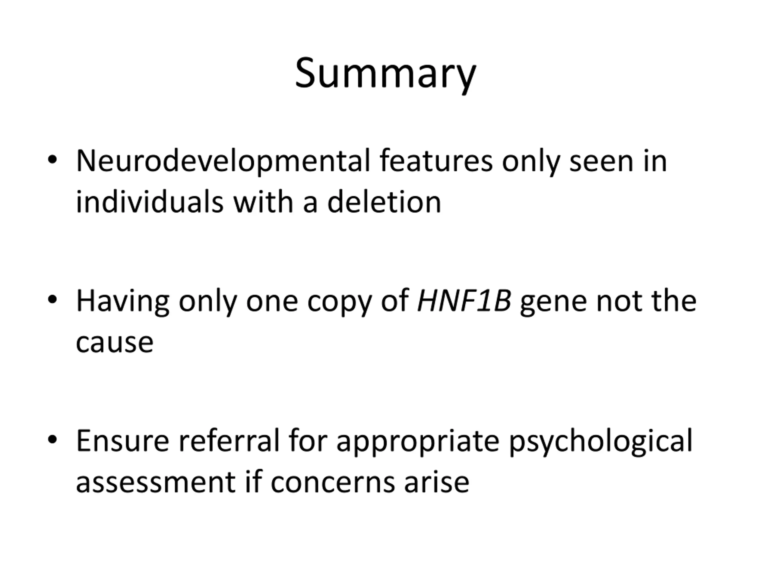 Summary Neurodevelopmental features only seen in individuals with a deletion Having only one copy of HNF1B gene not the cause Ensure referral for appropriate psychological assessment if concerns arise