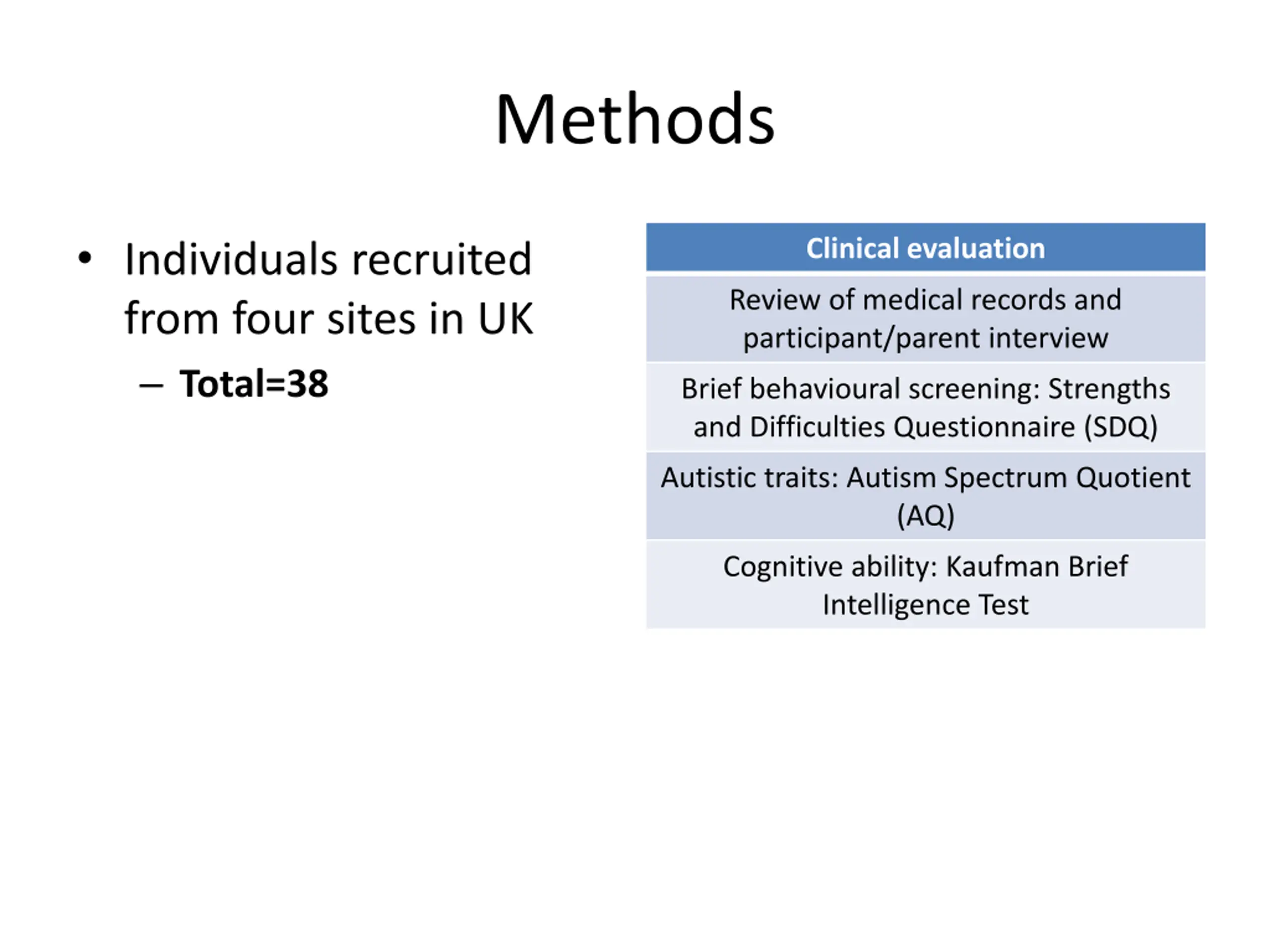 Methods Individuals recruited from four sites in UK Total=38 Clinical evaluation Review of medical records and participant/parent interview Brief behavioural screening: Strengths and Difficulties Questionnaire (SDQ) Autistic traits: Autism Spectrum Quotient (AQ) Cognitive ability: Kaufman Brief Intelligence Test