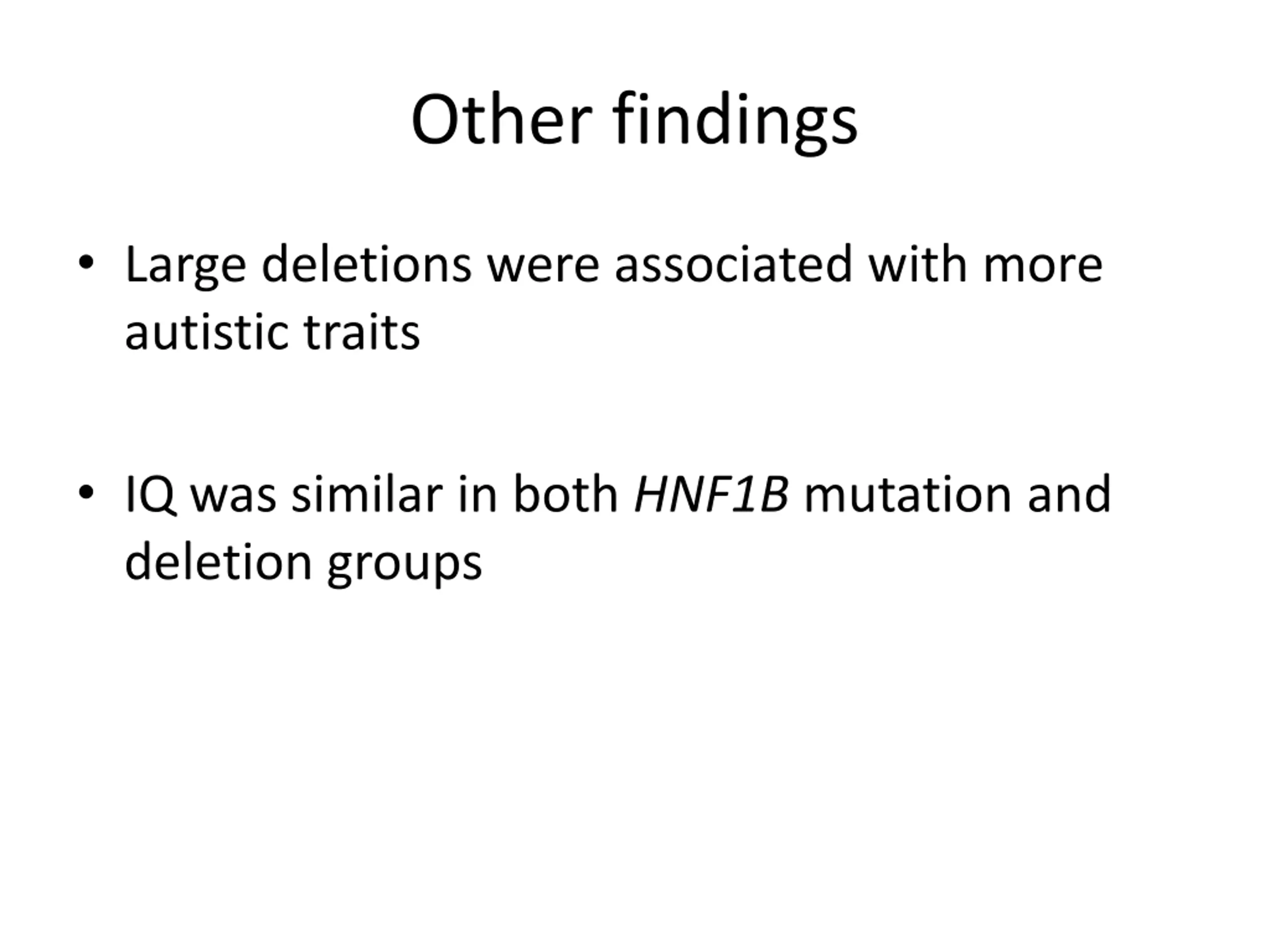 Other findings Large deletions were associated with more autistic traits IQ was similar in both HNF1B mutation and deletion groups