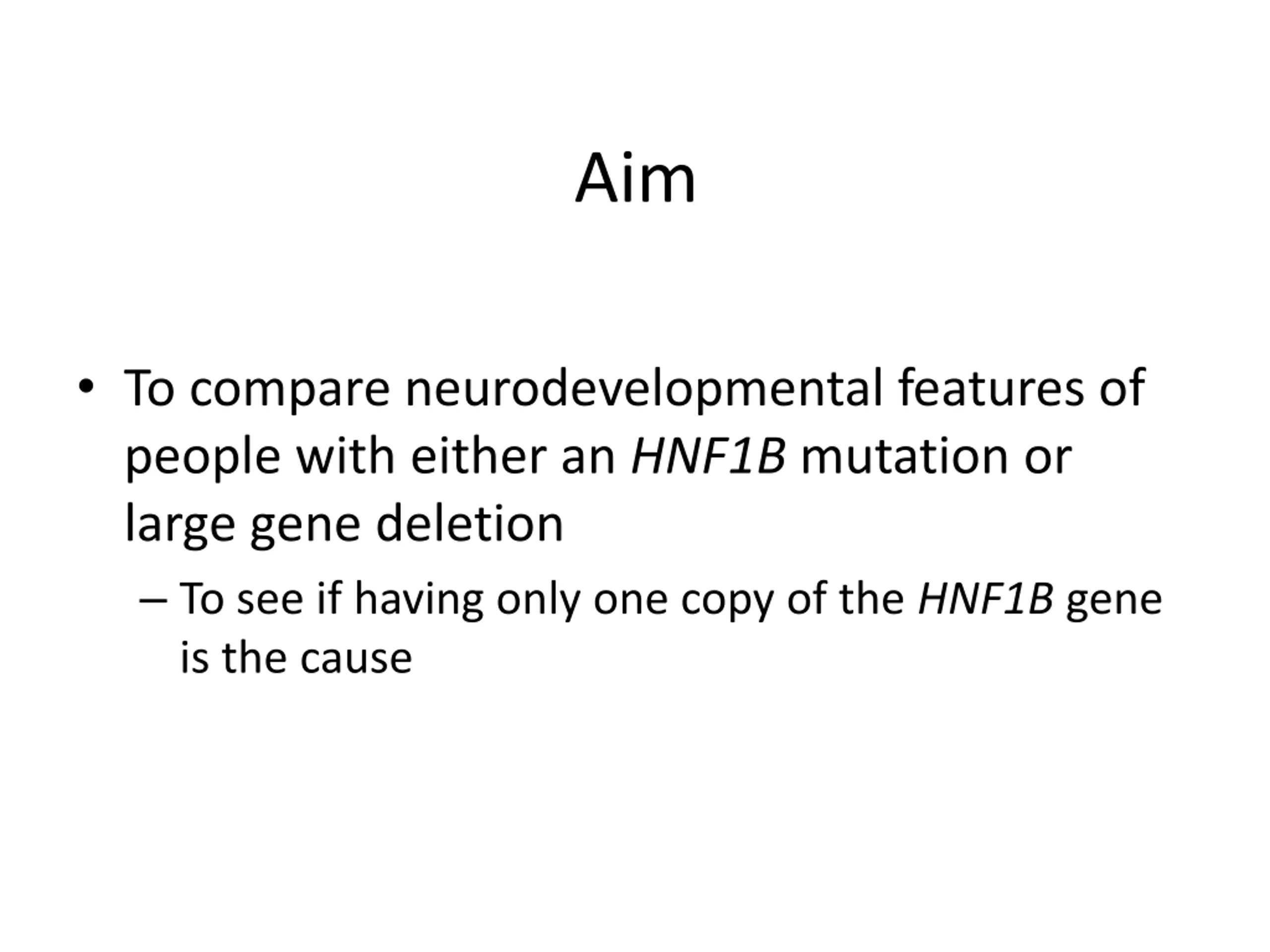 Aim To compare neurodevelopmental features of people with either an HNF1B mutation or large gene deletion To see if having only one copy of the HNF1B gene is the cause