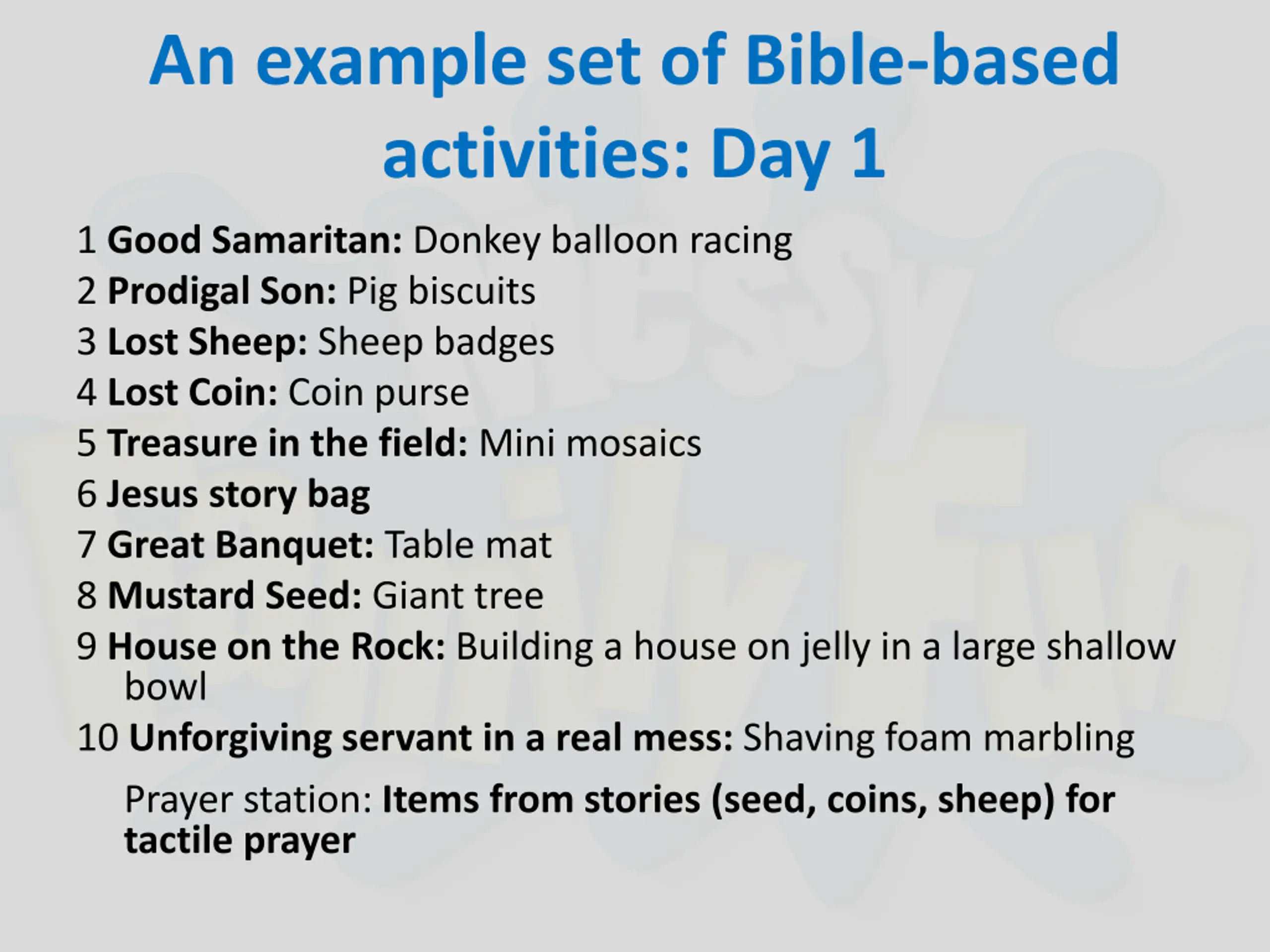 An example set of Bible-based activities: Day 1 1 Good Samaritan: Donkey balloon racing 2 Prodigal Son: Pig biscuits 3 Lost Sheep: Sheep badges 4 Lost Coin: Coin purse 5 Treasure in the field: Mini mosaics 6 Jesus story bag 7 Great Banquet: Table mat 8 Mustard Seed: Giant tree 9 House on the Rock: Building a house on jelly in a large shallow bowl 10 Unforgiving servant in a real mess: Shaving foam marbling Prayer station: Items from stories (seed, coins, sheep) for tactile prayer