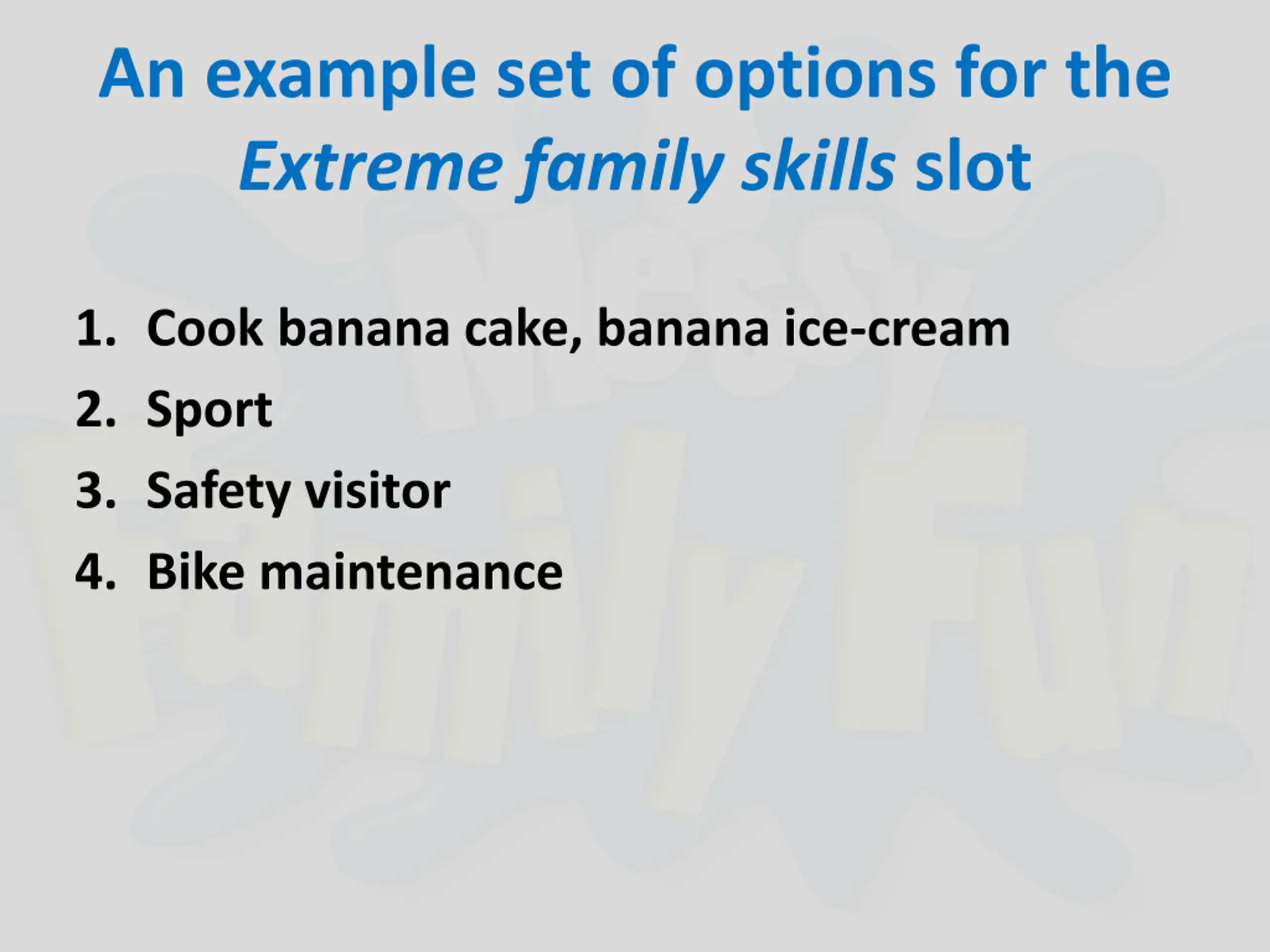 An example set of options for the Extreme family skills slot 1. Cook banana cake, banana ice-cream 2. Sport 3. Safety visitor 4. Bike maintenance