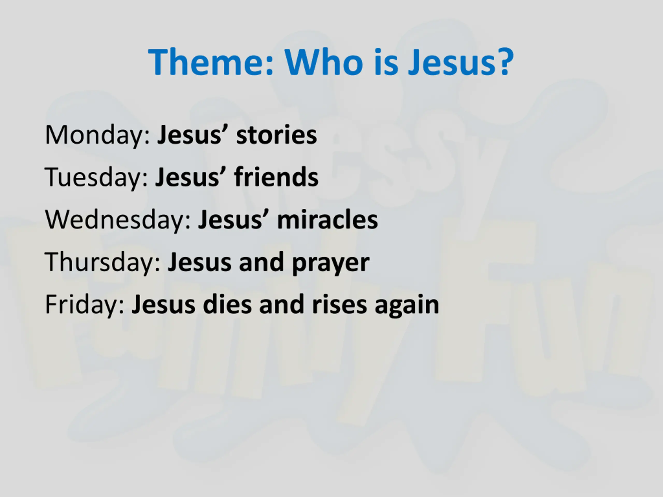Theme: Who is Jesus? Monday: Jesus stories Tuesday: Jesus friends Wednesday: Jesus miracles Thursday: Jesus and prayer Friday: Jesus dies and rises again