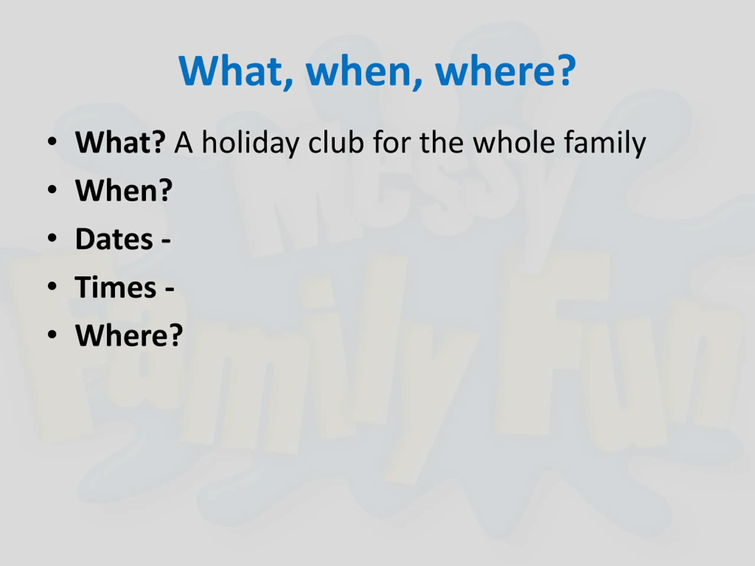 What, when, where? What? A holiday club for the whole family When? Dates - Times - Where?