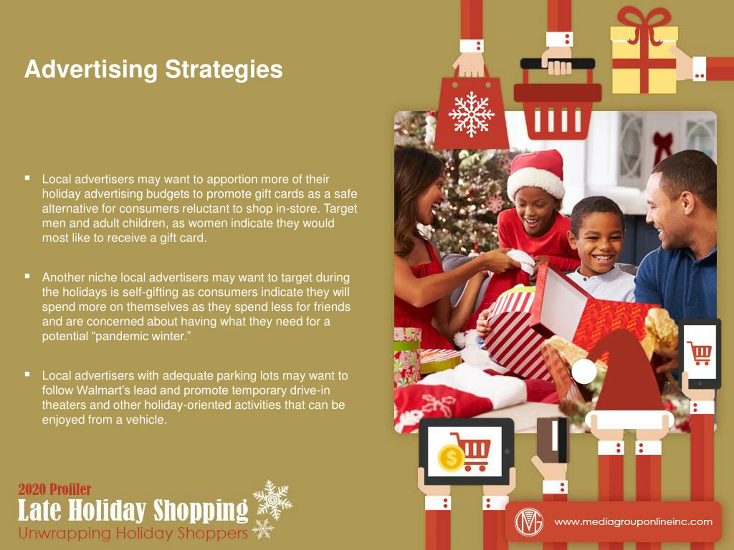 Advertising Strategies Local advertisers may want to apportion more of their holiday advertising budgets to promote gift cards as a safe alternative for consumers reluctant to shop in-store. Target men and adult children, as women indicate they would most like to receive a gift card. Another niche local advertisers may want to target during the holidays is self-gifting as consumers indicate they will spend more on themselves as they spend less for friends and are concerned about having what they need for a potential pandemic winter. Local advertisers with adequate parking lots may want to follow Walmart s lead and promote temporary drive-in theaters and other holiday-oriented activities that can be enjoyed from a vehicle.