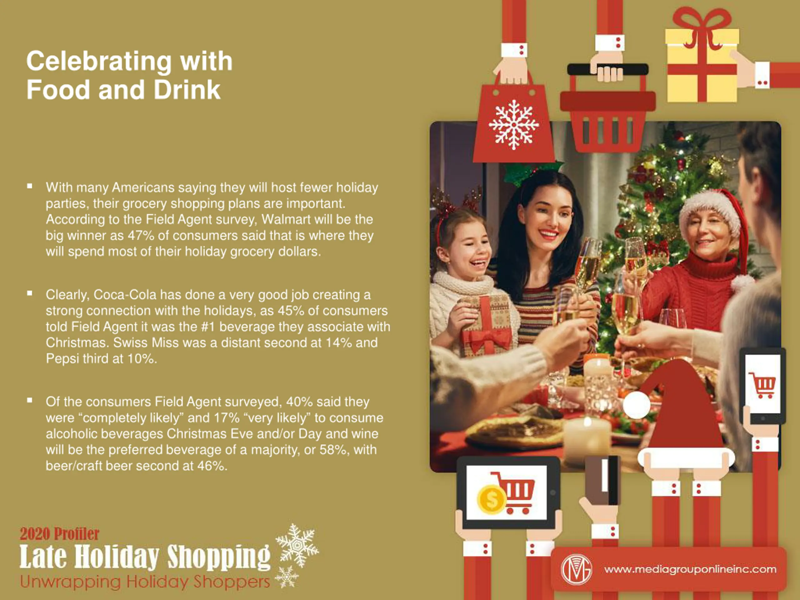 Celebrating with Food and Drink With many Americans saying they will host fewer holiday parties, their grocery shopping plans are important. According to the Field Agent survey, Walmart will be the big winner as 47% of consumers said that is where they will spend most of their holiday grocery dollars. Clearly, Coca-Cola has done a very good job creating a strong connection with the holidays, as 45% of consumers told Field Agent it was the #1 beverage they associate with Christmas. Swiss Miss was a distant second at 14% and Pepsi third at 10%. Of the consumers Field Agent surveyed, 40% said they were completely likely and 17% very likely to consume alcoholic beverages Christmas Eve and/or Day and wine will be the preferred beverage of a majority, or 58%, with beer/craft beer second at 46%.