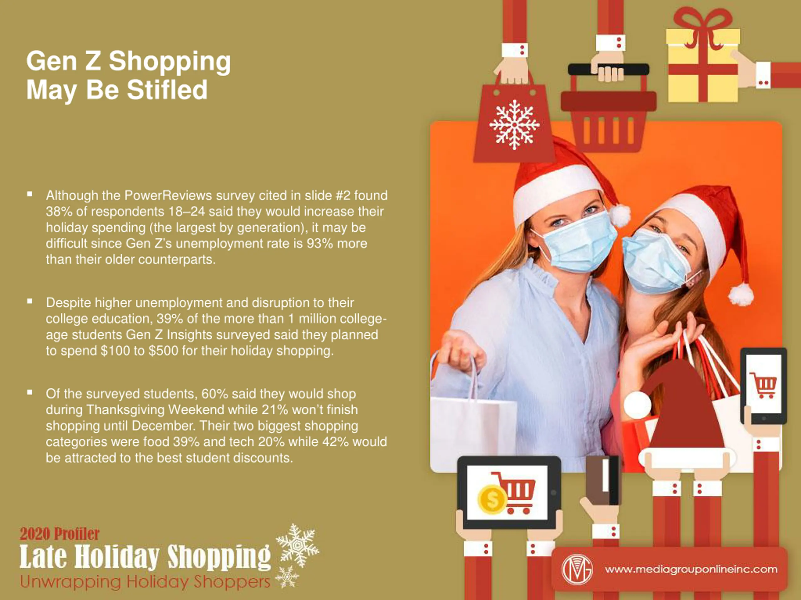 Gen Z Shopping May Be Stifled Although the PowerReviews survey cited in slide #2 found 38% of respondents 18 24 said they would increase their holiday spending (the largest by generation), it may be difficult since Gen Z s unemployment rate is 93% more than their older counterparts. Despite higher unemployment and disruption to their college education, 39% of the more than 1 million college- age students Gen Z Insights surveyed said they planned to spend $100 to $500 for their holiday shopping. Of the surveyed students, 60% said they would shop during Thanksgiving Weekend while 21% won t finish shopping until December. Their two biggest shopping categories were food 39% and tech 20% while 42% would be attracted to the best student discounts.