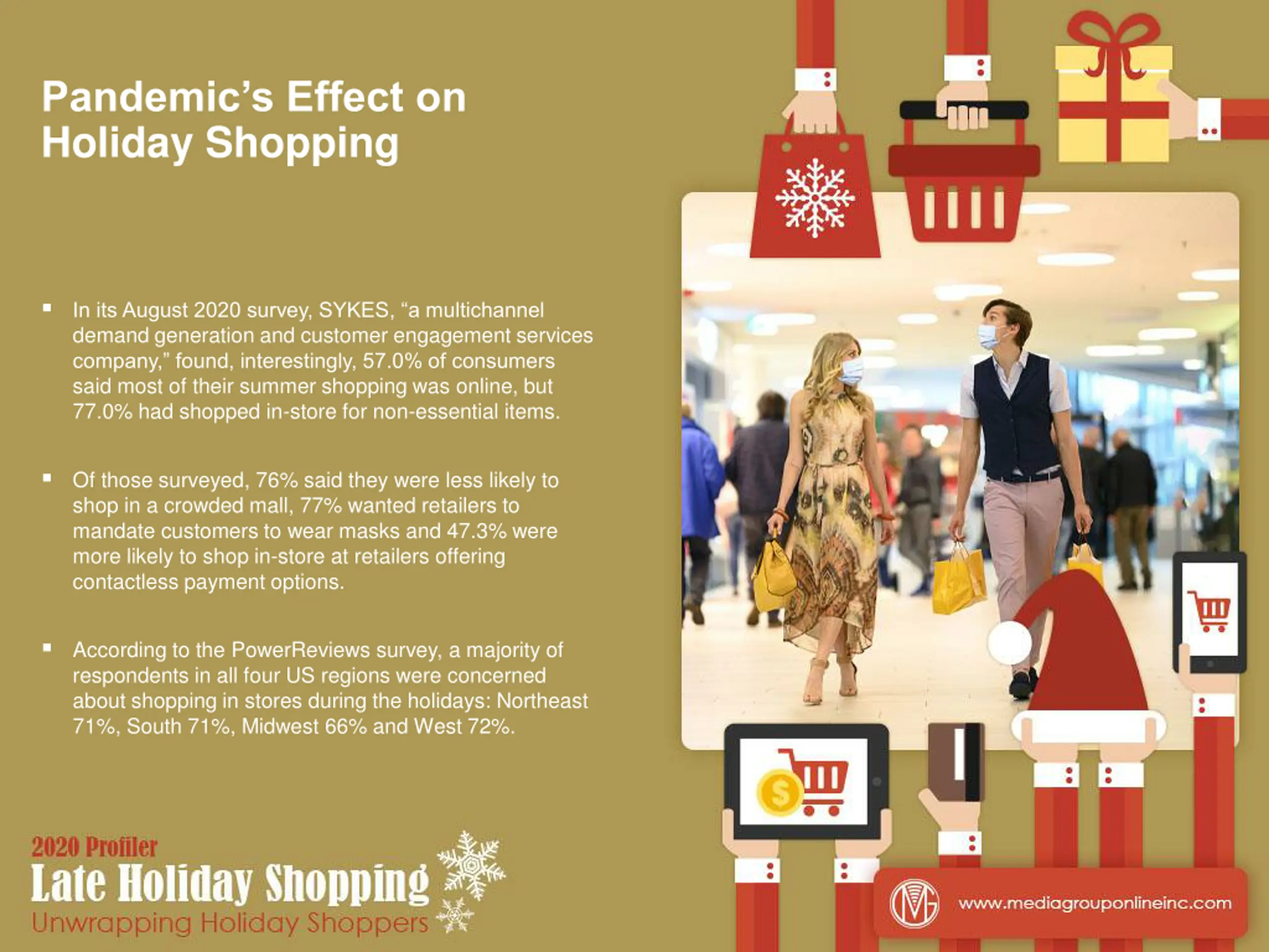 Pandemics Effect on Holiday Shopping In its August 2020 survey, SYKES, a multichannel demand generation and customer engagement services company, found, interestingly, 57.0% of consumers said most of their summer shopping was online, but 77.0% had shopped in-store for non-essential items. Of those surveyed, 76% said they were less likely to shop in a crowded mall, 77% wanted retailers to mandate customers to wear masks and 47.3% were more likely to shop in-store at retailers offering contactless payment options. According to the PowerReviews survey, a majority of respondents in all four US regions were concerned about shopping in stores during the holidays: Northeast 71%, South 71%, Midwest 66% and West 72%.