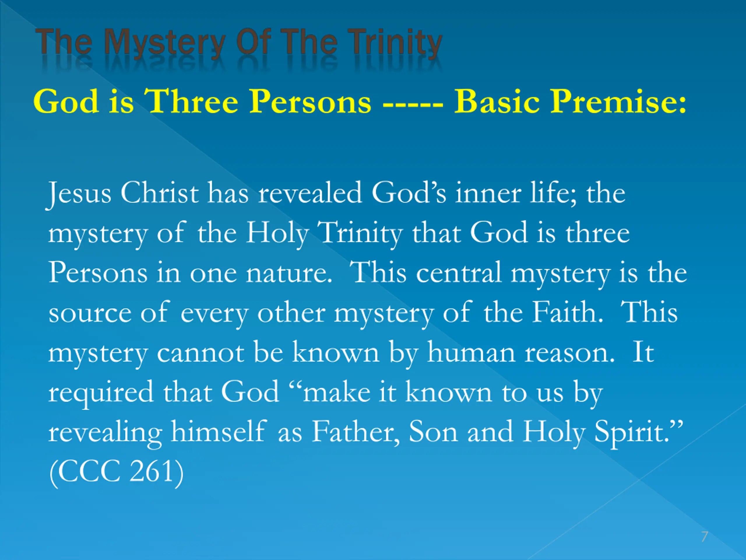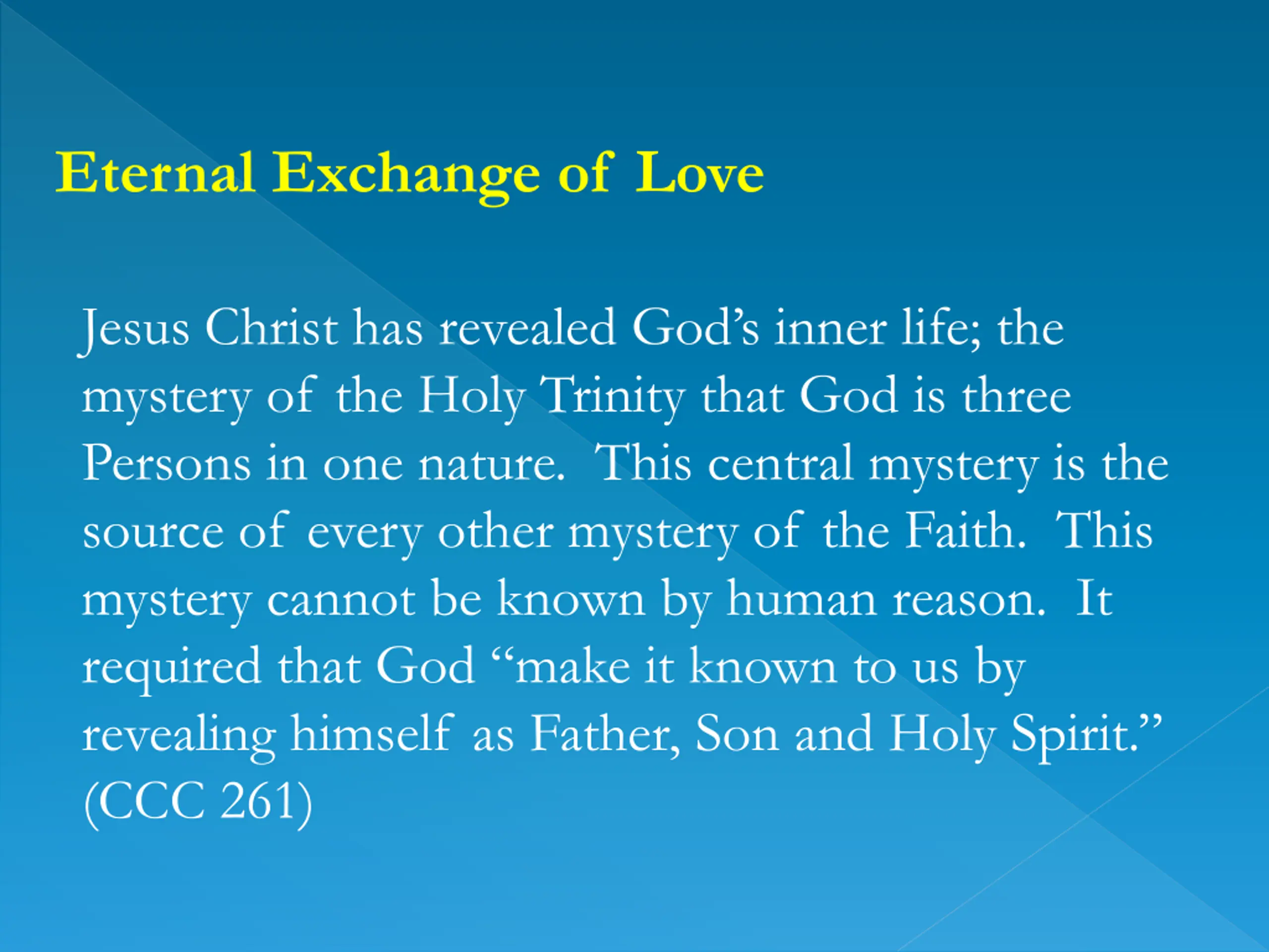 Eternal Exchange of Love Jesus Christ has revealed God s inner life; the mystery of the Holy Trinity that God is three Persons in one nature. This central mystery is the source of every other mystery of the Faith. This mystery cannot be known by human reason. It required that God make it known to us by revealing himself as Father, Son and Holy Spirit. (CCC 261)