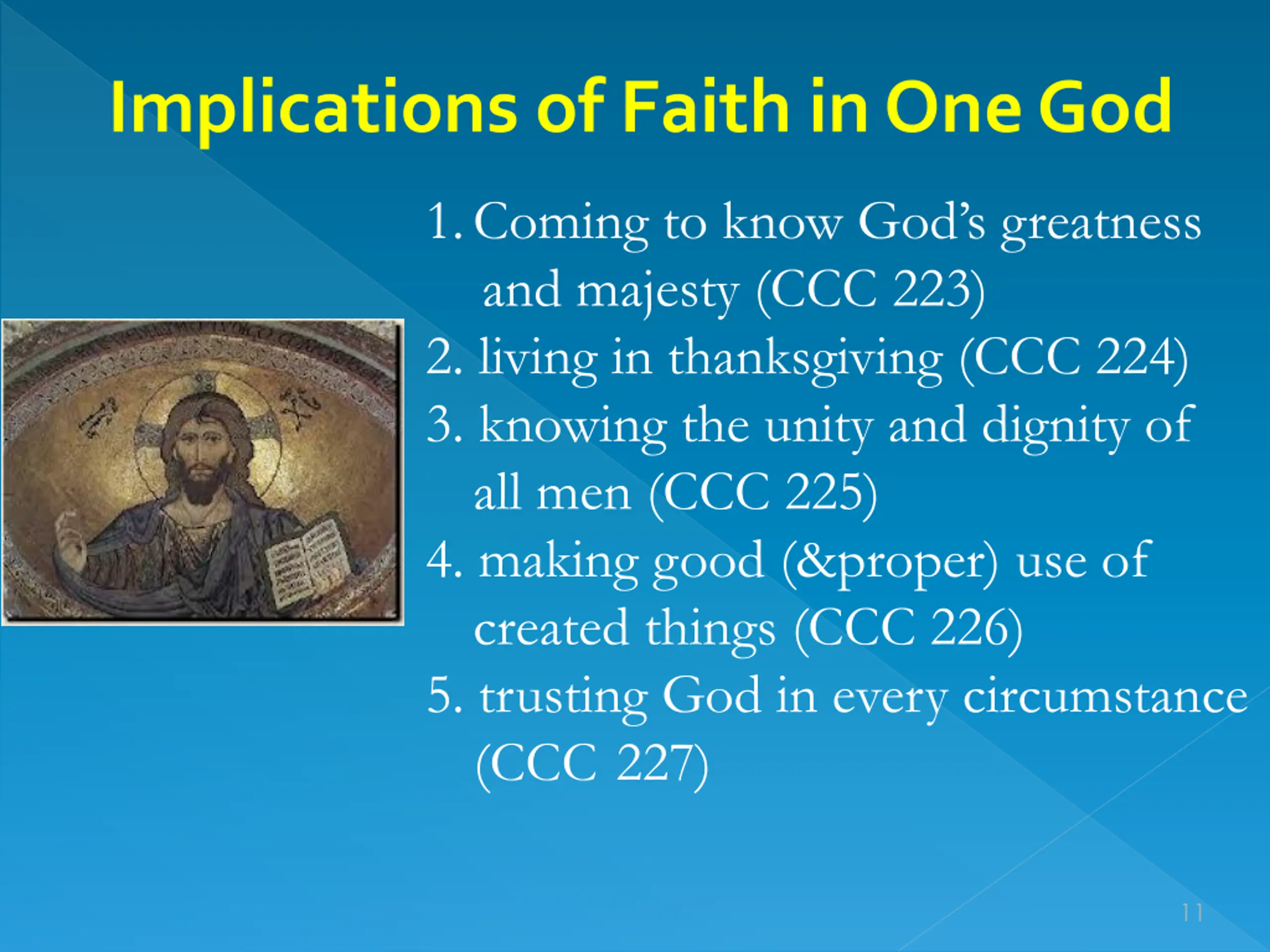 Implications of Faith in One God 1.Coming to know God s greatness and majesty (CCC 223) 2. living in thanksgiving (CCC 224) 3. knowing the unity and dignity of all men (CCC 225) 4. making good (&proper) use of created things (CCC 226) 5. trusting God in every circumstance (CCC 227) 11