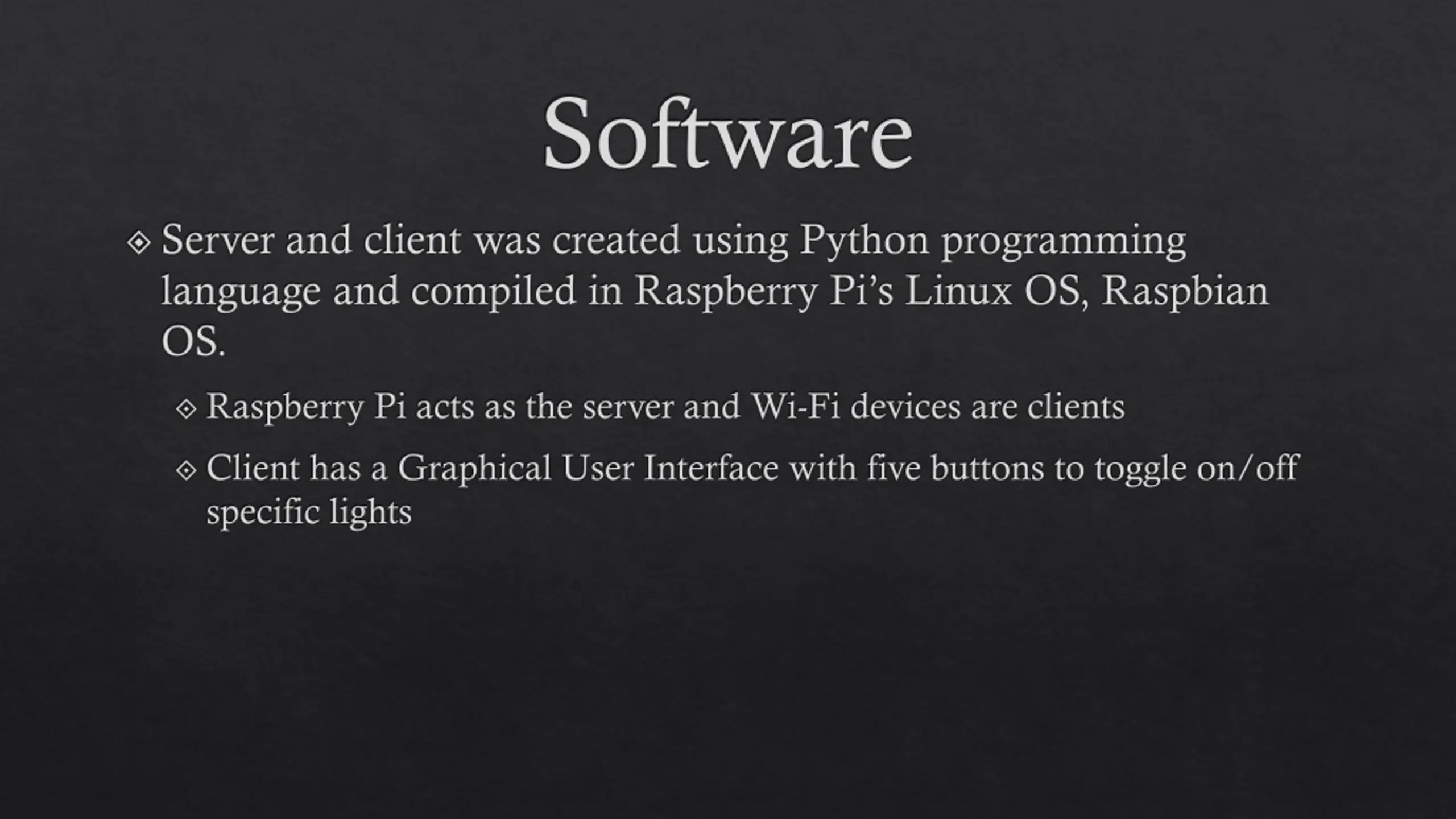 Software Server and client was created using Python programming language and compiled in Raspberry Pi s Linux OS, Raspbian OS. Raspberry Pi acts as the server and Wi-Fi devices are clients Client has a Graphical User Interface with five buttons to toggle on/off specific lights