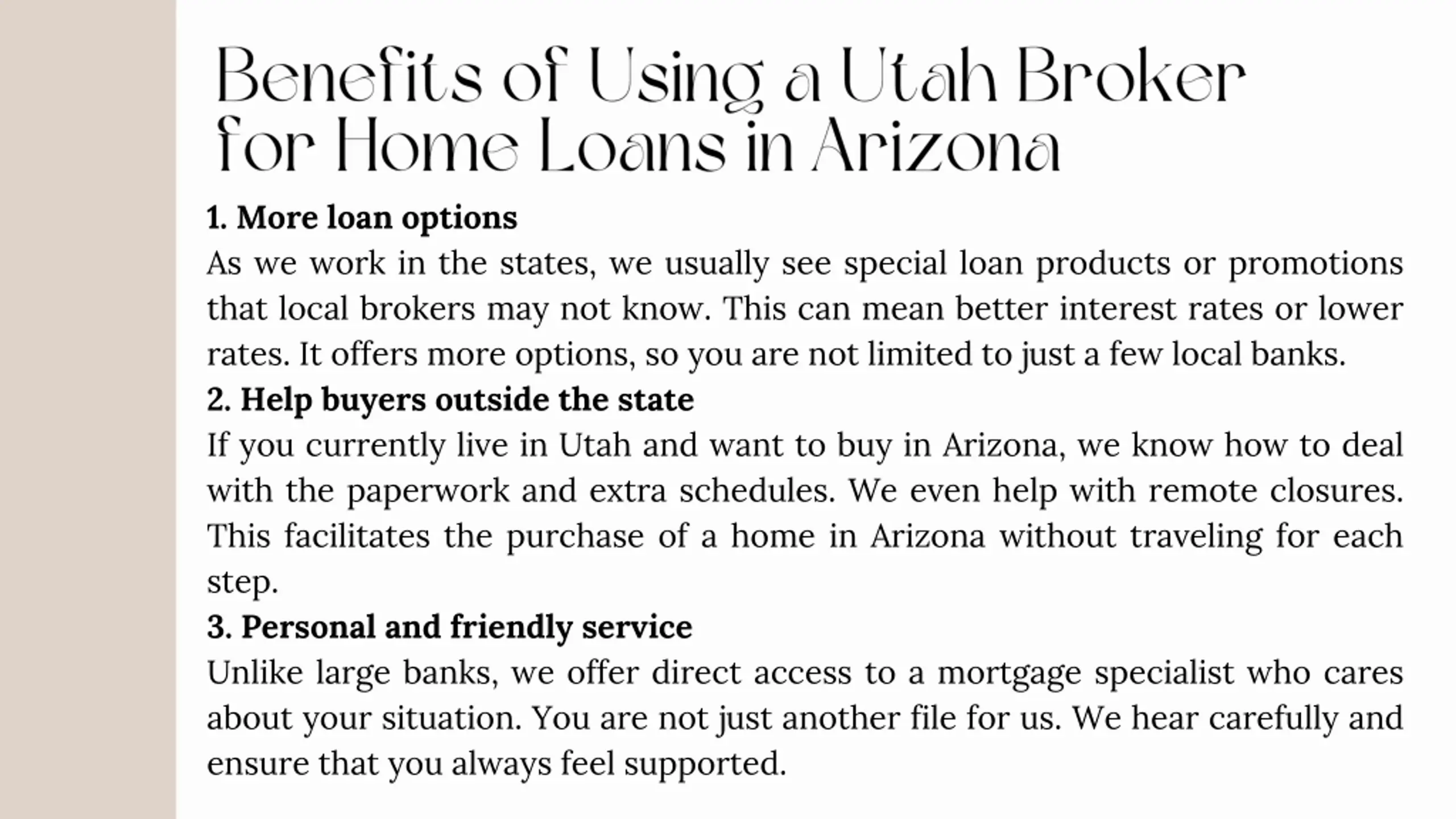 1. More loan options As we work in the states, we usually see special loan products or promotions that local brokers may not know. This can mean better interest rates or lower rates. It offers more options, so you are not limited to just a few local banks. 2. Help buyers outside the state If you currently live in Utah and want to buy in Arizona, we know how to deal with the paperwork and extra schedules. We even help with remote closures. This facilitates the purchase of a home in Arizona without traveling for each step. 3. Personal and friendly service Unlike large banks, we offer direct access to a mortgage specialist who cares about your situation. You are not just another file for us. We hear carefully and ensure that you always feel supported.