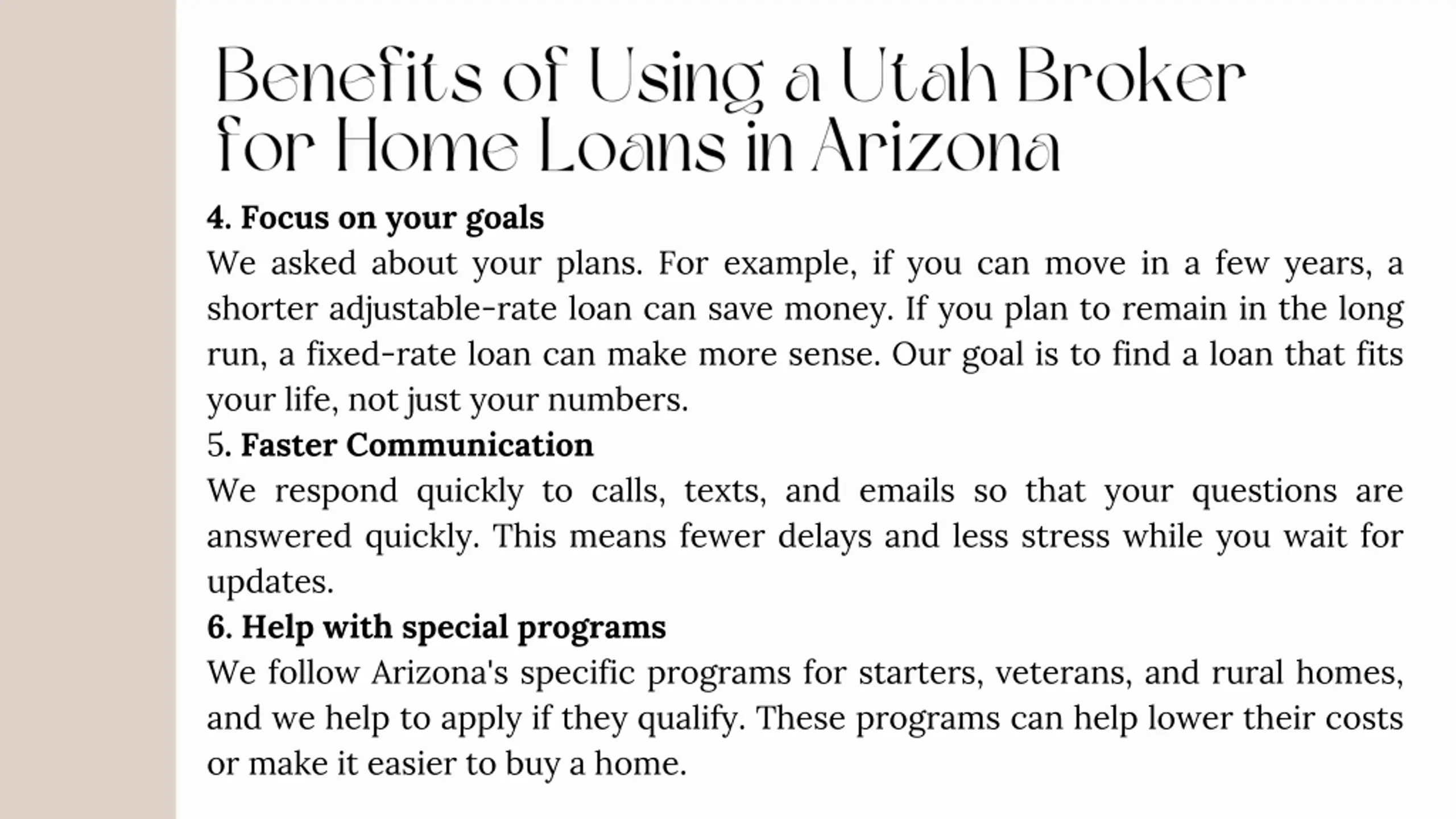 4. Focus on your goals We asked about your plans. For example, if you can move in a few years, a shorter adjustable-rate loan can save money. If you plan to remain in the long run, a fixed-rate loan can make more sense. Our goal is to find a loan that fits your life, not just your numbers. 5. Faster Communication We respond quickly to calls, texts, and emails so that your questions are answered quickly. This means fewer delays and less stress while you wait for updates. 6. Help with special programs We follow Arizona's specific programs for starters, veterans, and rural homes, and we help to apply if they qualify. These programs can help lower their costs or make it easier to buy a home.