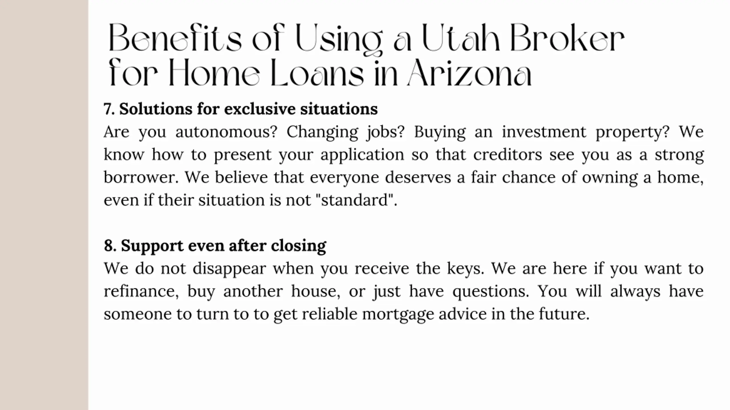 7. Solutions for exclusive situations Are you autonomous? Changing jobs? Buying an investment property? We know how to present your application so that creditors see you as a strong borrower. We believe that everyone deserves a fair chance of owning a home, even if their situation is not "standard". 8. Support even after closing We do not disappear when you receive the keys. We are here if you want to refinance, buy another house, or just have questions. You will always have someone to turn to to get reliable mortgage advice in the future.