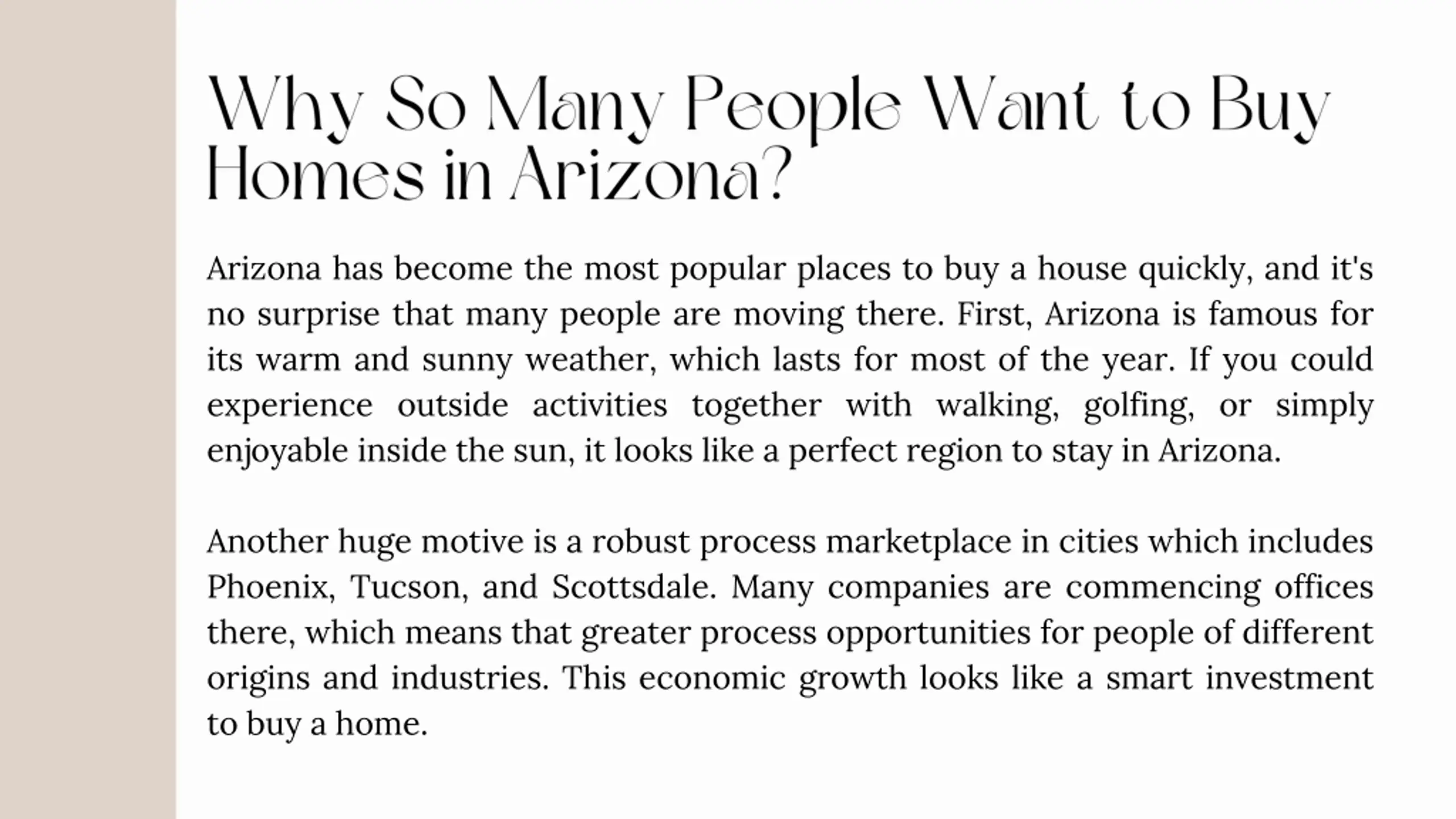 Arizona has become the most popular places to buy a house quickly, and it's no surprise that many people are moving there. First, Arizona is famous for its warm and sunny weather, which lasts for most of the year. If you could experience outside activities together with walking, golfing, or simply enjoyable inside the sun, it looks like a perfect region to stay in Arizona. Another huge motive is a robust process marketplace in cities which includes Phoenix, Tucson, and Scottsdale. Many companies are commencing offices there, which means that greater process opportunities for people of different origins and industries. This economic growth looks like a smart investment to buy a home.