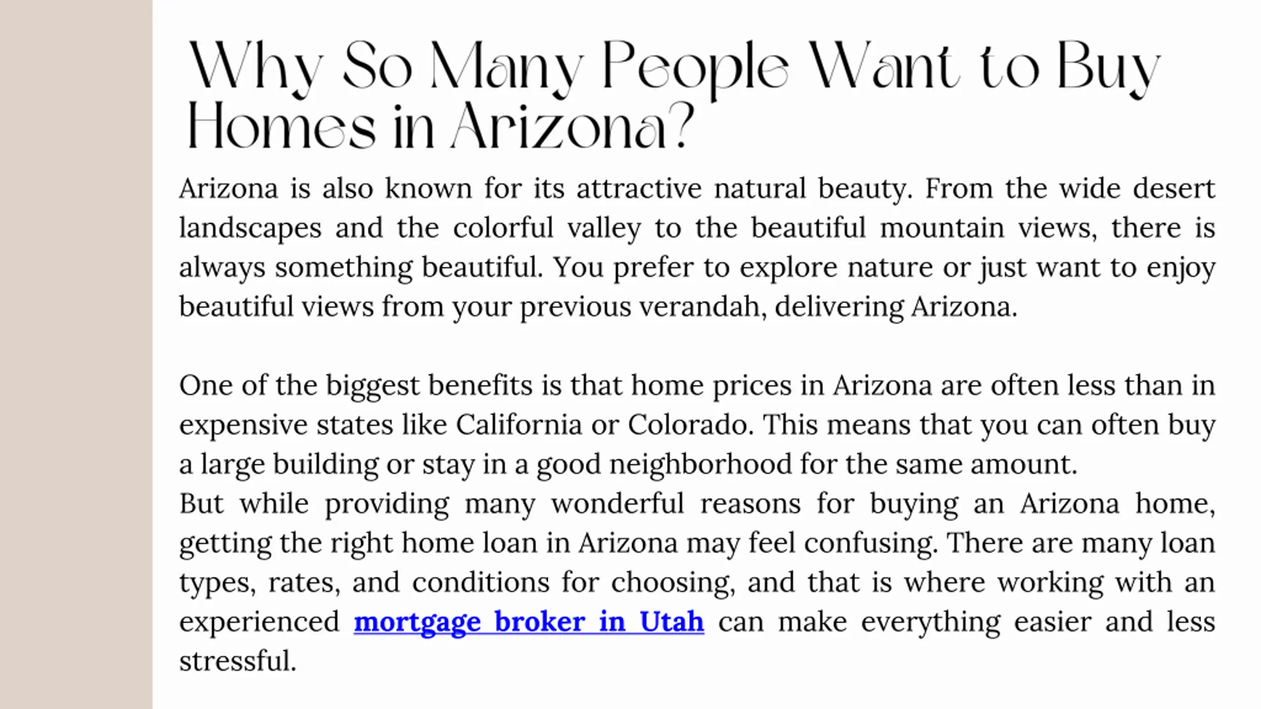 Arizona is also known for its attractive natural beauty. From the wide desert landscapes and the colorful valley to the beautiful mountain views, there is always something beautiful. You prefer to explore nature or just want to enjoy beautiful views from your previous verandah, delivering Arizona. One of the biggest benefits is that home prices in Arizona are often less than in expensive states like California or Colorado. This means that you can often buy a large building or stay in a good neighborhood for the same amount. But while providing many wonderful reasons for buying an Arizona home, getting the right home loan in Arizona may feel confusing. There are many loan types, rates, and conditions for choosing, and that is where working with an experienced mortgage broker in Utah can make everything easier and less stressful.