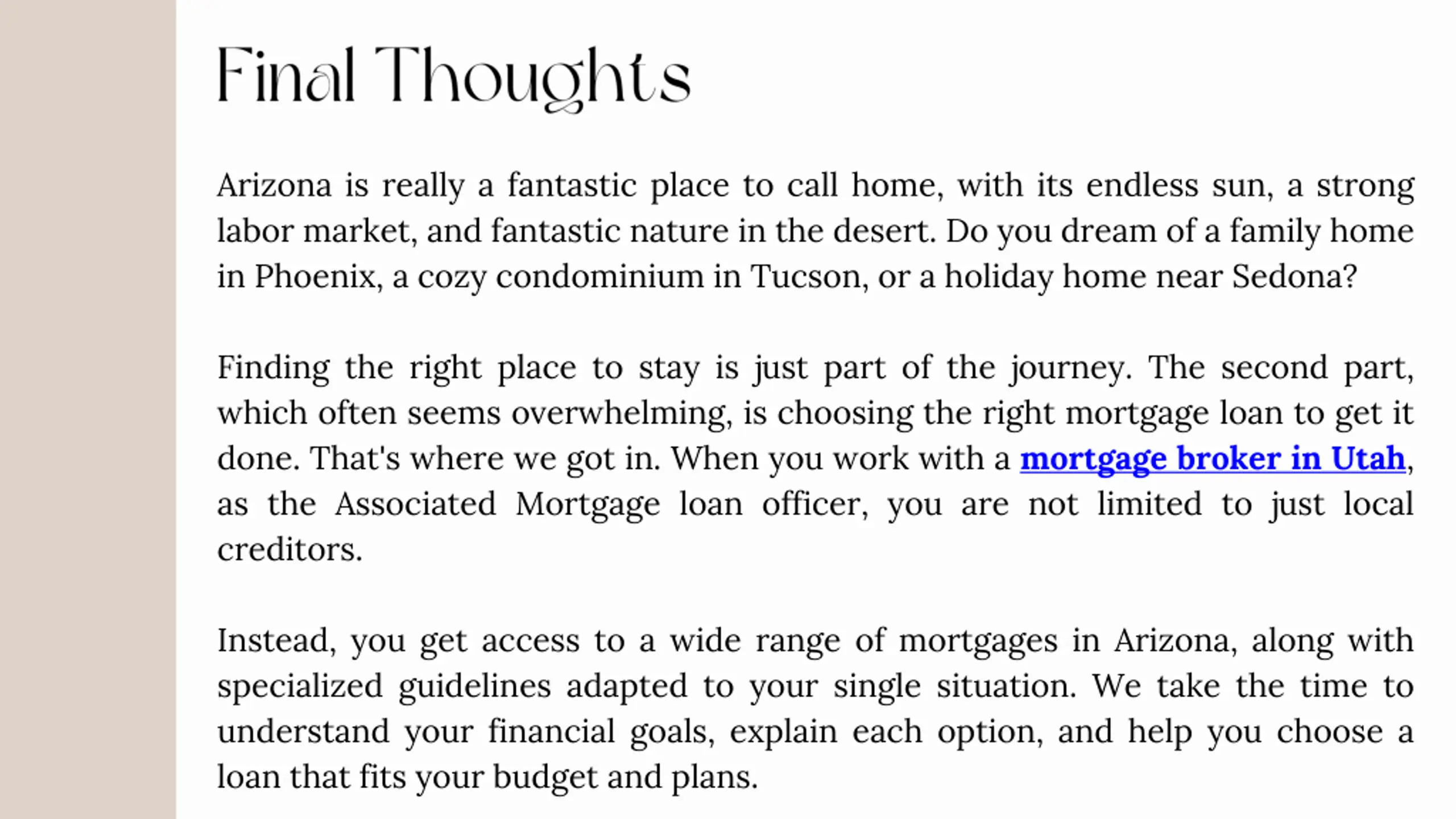 Arizona is really a fantastic place to call home, with its endless sun, a strong labor market, and fantastic nature in the desert. Do you dream of a family home in Phoenix, a cozy condominium in Tucson, or a holiday home near Sedona? Finding the right place to stay is just part of the journey. The second part, which often seems overwhelming, is choosing the right mortgage loan to get it done. That's where we got in. When you work with a mortgage broker in Utah, as the Associated Mortgage loan officer, you are not limited to just local creditors. Instead, you get access to a wide range of mortgages in Arizona, along with specialized guidelines adapted to your single situation. We take the time to understand your financial goals, explain each option, and help you choose a loan that fits your budget and plans.