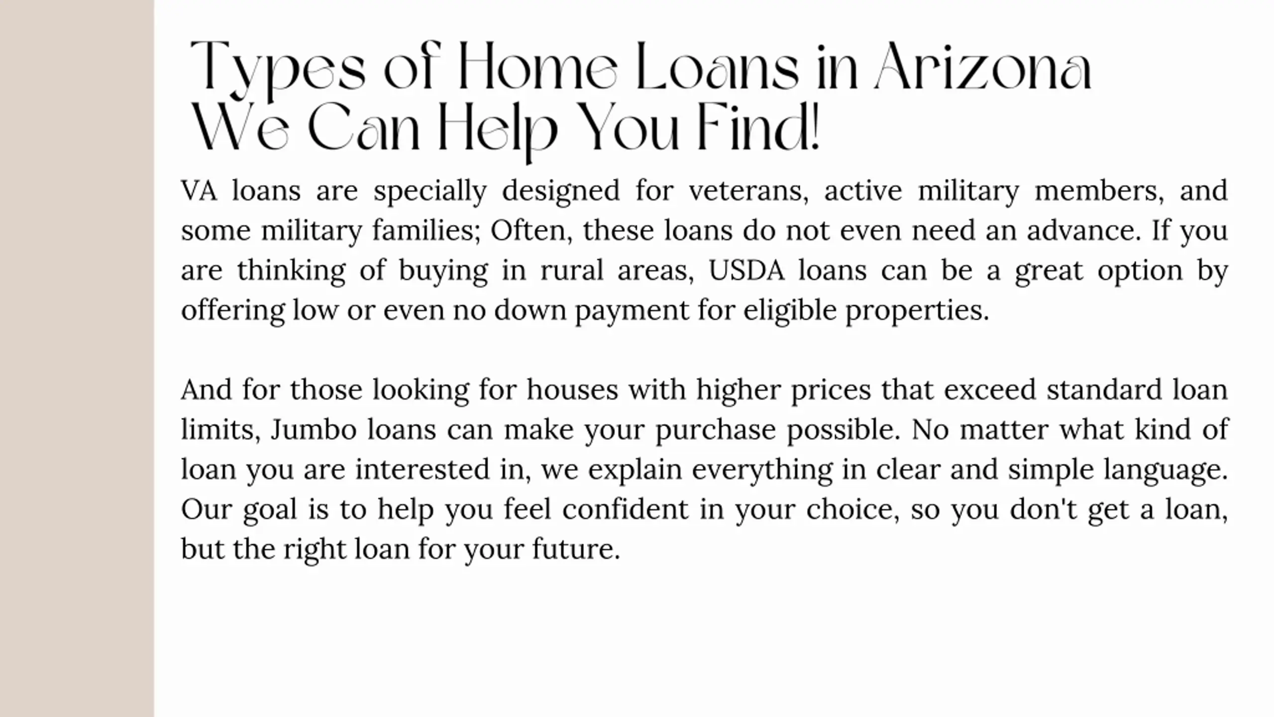 VA loans are specially designed for veterans, active military members, and some military families; Often, these loans do not even need an advance. If you are thinking of buying in rural areas, USDA loans can be a great option by offering low or even no down payment for eligible properties. And for those looking for houses with higher prices that exceed standard loan limits, Jumbo loans can make your purchase possible. No matter what kind of loan you are interested in, we explain everything in clear and simple language. Our goal is to help you feel confident in your choice, so you don't get a loan, but the right loan for your future.
