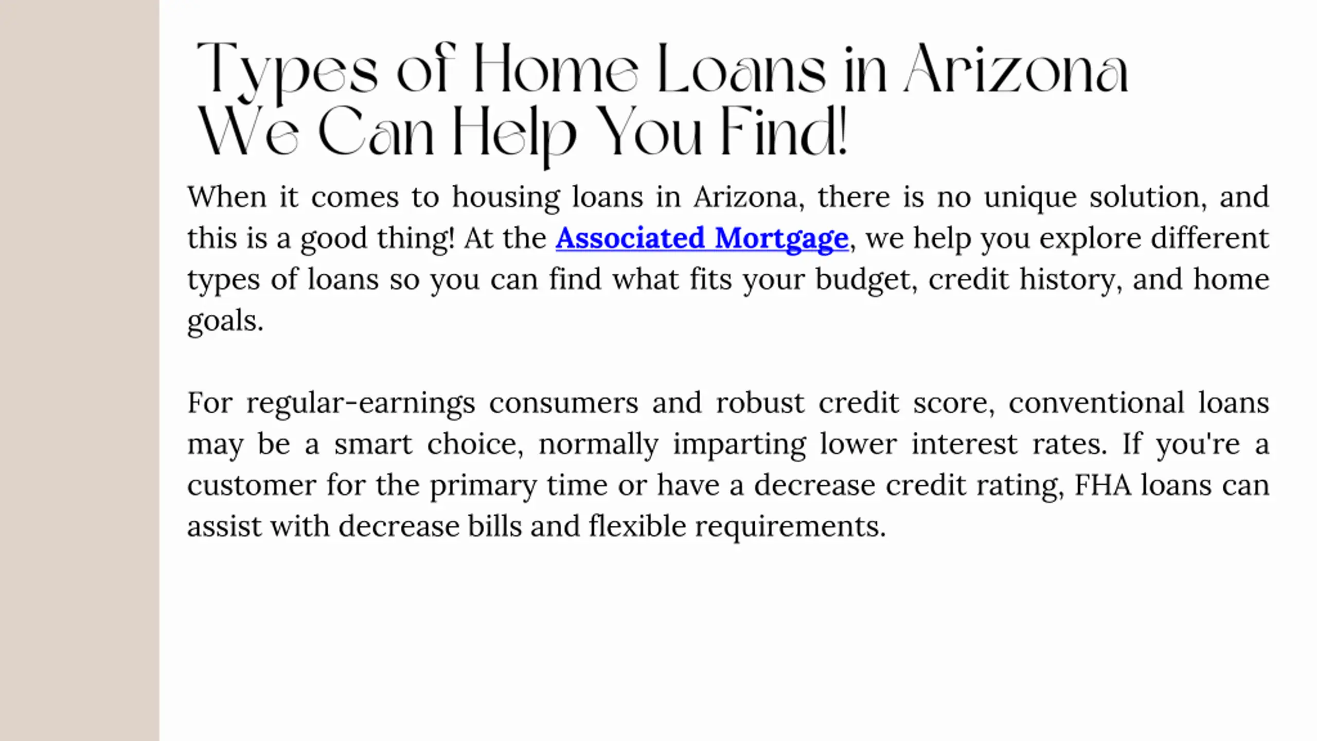 When it comes to housing loans in Arizona, there is no unique solution, and this is a good thing! At the Associated Mortgage, we help you explore different types of loans so you can find what fits your budget, credit history, and home goals. For regular-earnings consumers and robust credit score, conventional loans may be a smart choice, normally imparting lower interest rates. If you're a customer for the primary time or have a decrease credit rating, FHA loans can assist with decrease bills and flexible requirements.