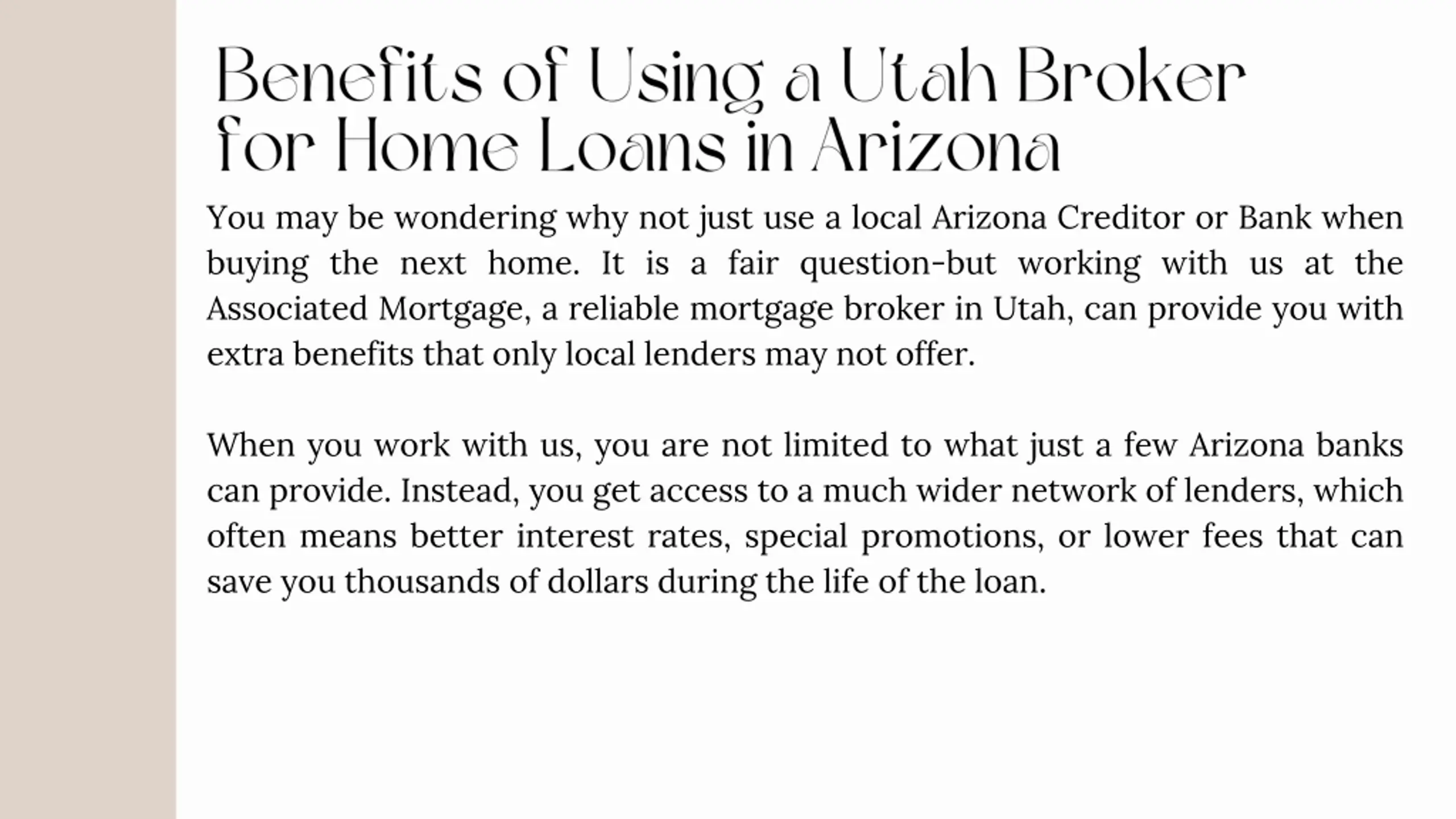 You may be wondering why not just use a local Arizona Creditor or Bank when buying the next home. It is a fair question-but working with us at the Associated Mortgage, a reliable mortgage broker in Utah, can provide you with extra benefits that only local lenders may not offer. When you work with us, you are not limited to what just a few Arizona banks can provide. Instead, you get access to a much wider network of lenders, which often means better interest rates, special promotions, or lower fees that can save you thousands of dollars during the life of the loan.