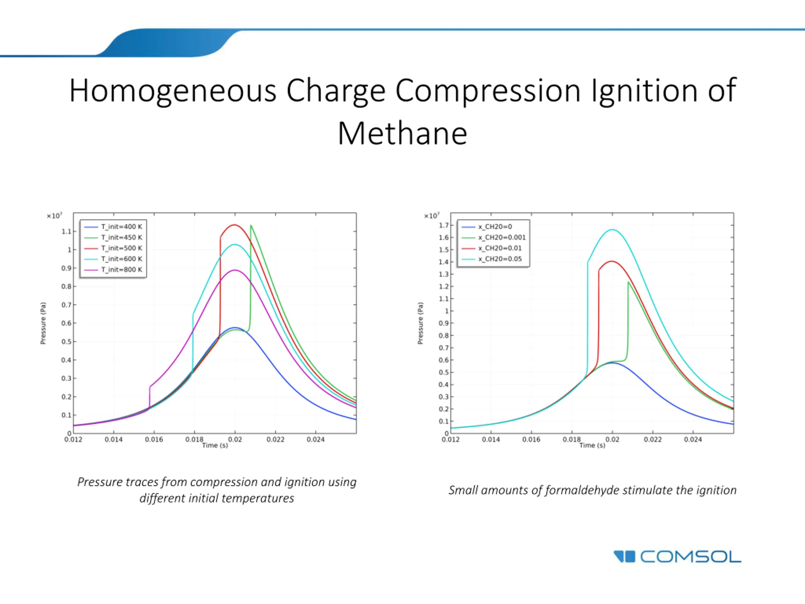 Homogeneous Charge Compression Ignition of Methane Pressure traces from compression and ignition using different initial temperatures Small amounts of formaldehyde stimulate the ignition
