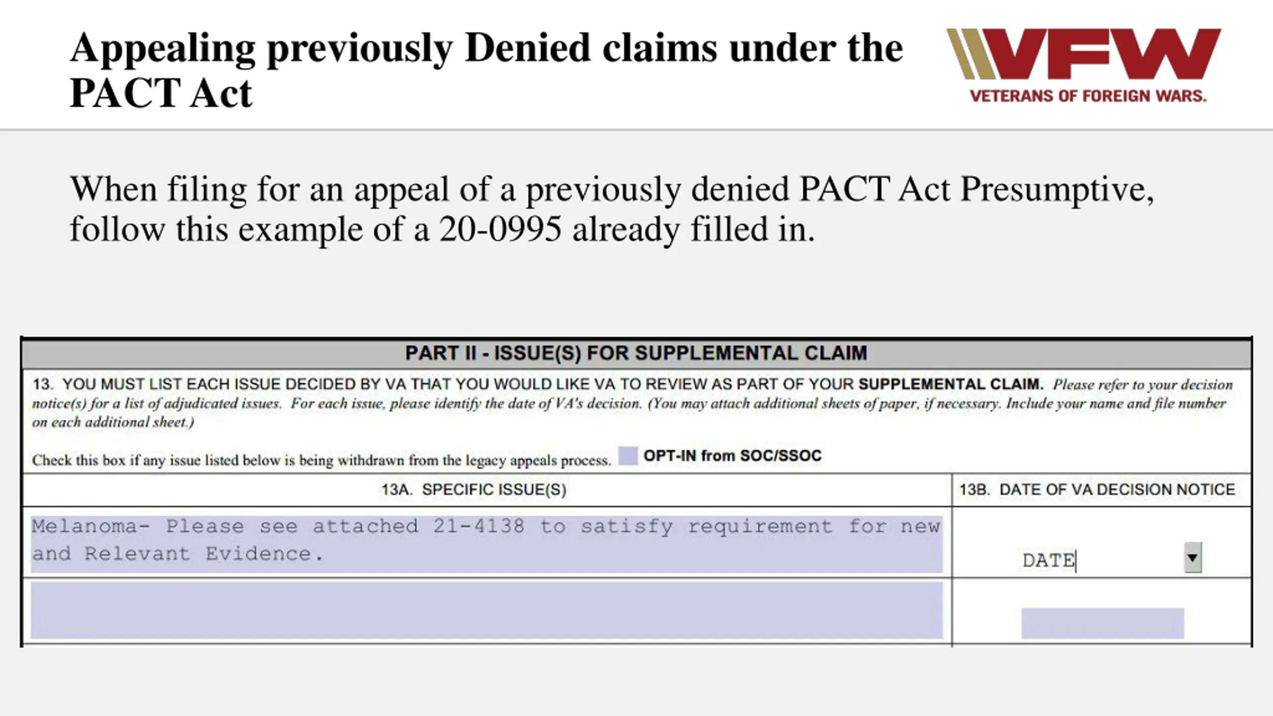 Appealing previously Denied claims under the PACT Act When filing for an appeal of a previously denied PACT Act Presumptive, follow this example of a 20-0995 already filled in.