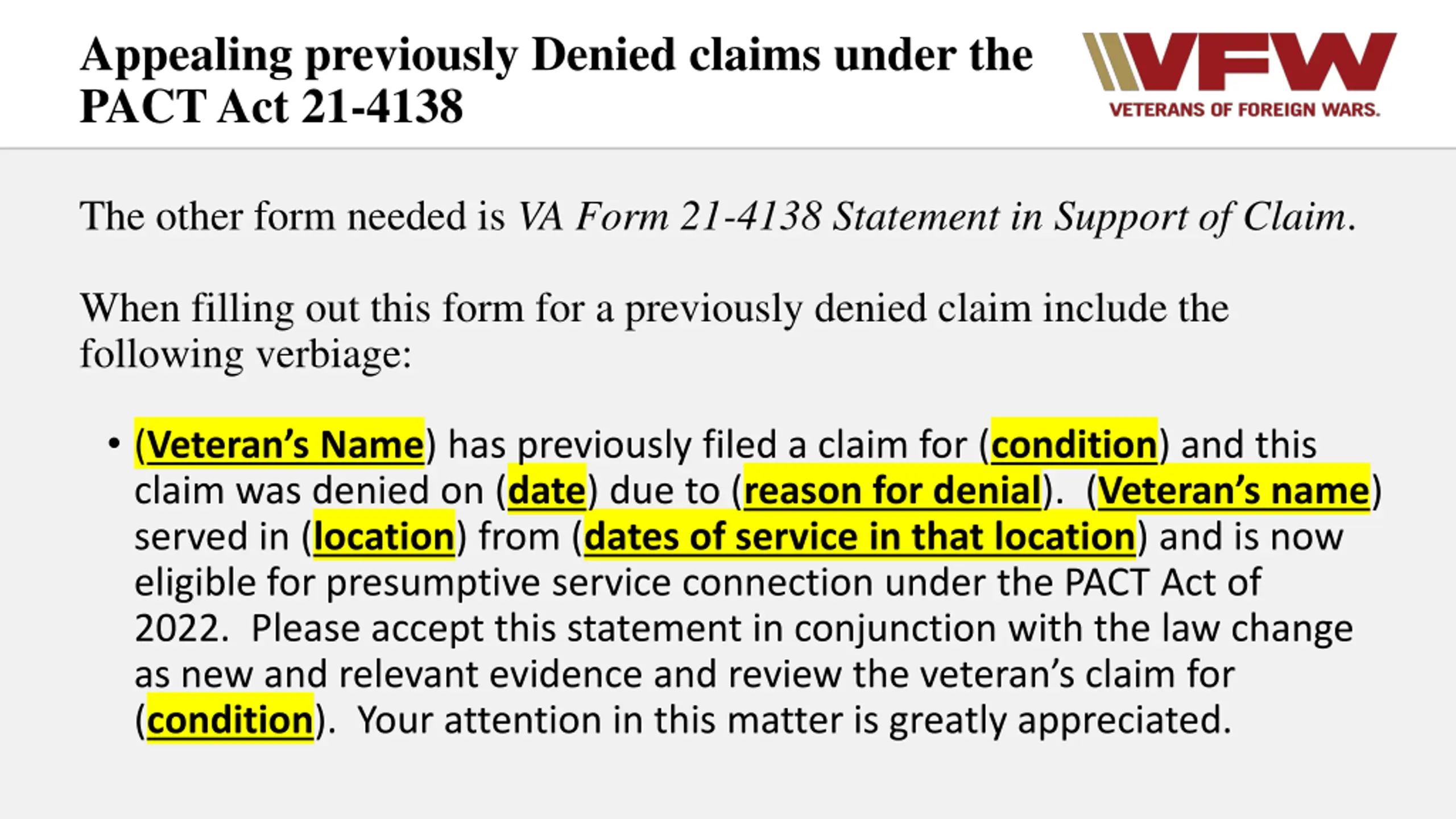Appealing previously Denied claims under the PACT Act 21-4138 The other form needed is VA Form 21-4138 Statement in Support of Claim. When filling out this form for a previously denied claim include the following verbiage: (Veteran s Name) has previously filed a claim for (condition) and this claim was denied on (date) due to (reason for denial). (Veteran s name) served in (location) from (dates of service in that location) and is now eligible for presumptive service connection under the PACT Act of 2022. Please accept this statement in conjunction with the law change as new and relevant evidence and review the veteran s claim for (condition). Your attention in this matter is greatly appreciated.