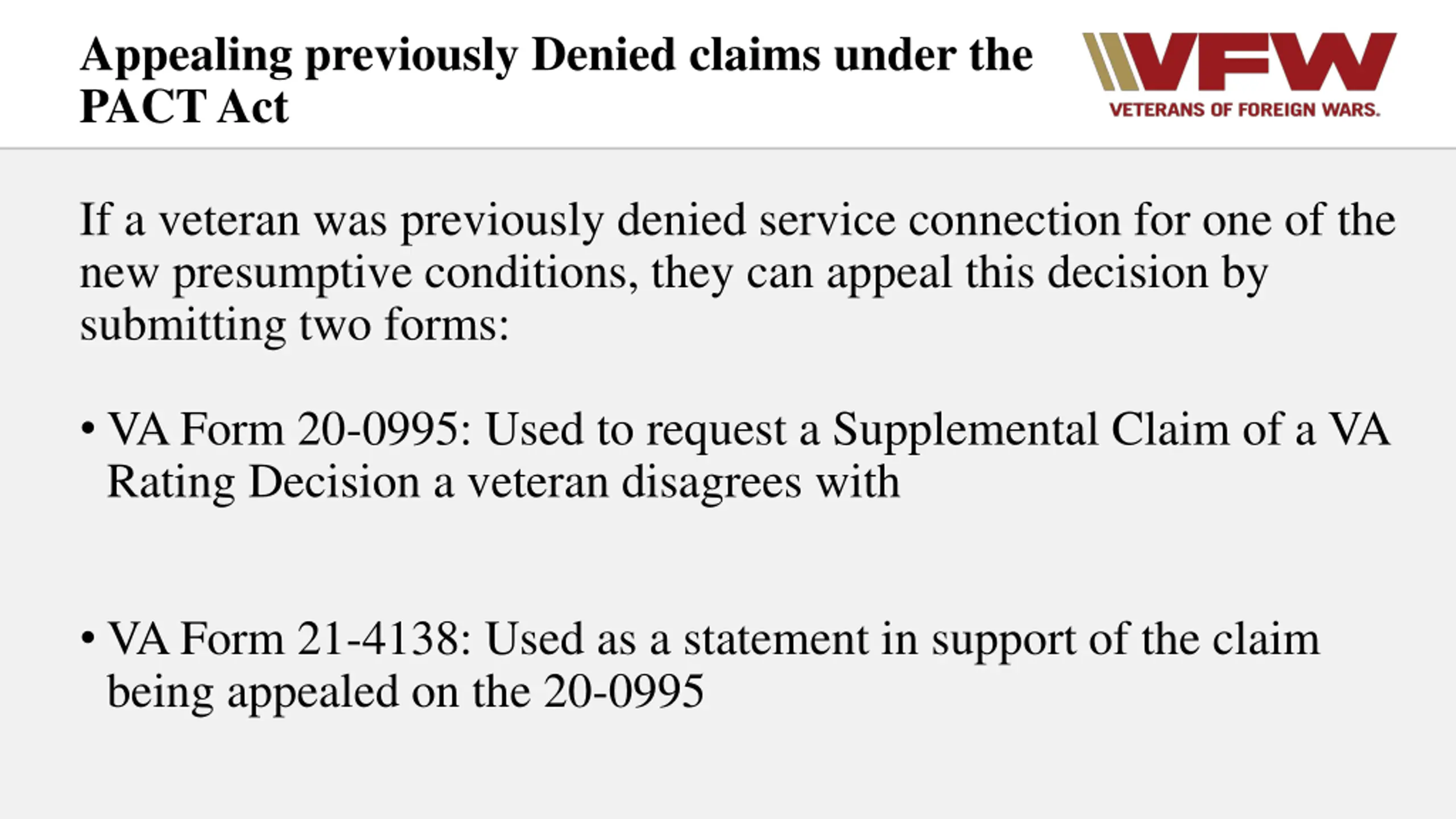 Appealing previously Denied claims under the PACT Act If a veteran was previously denied service connection for one of the new presumptive conditions, they can appeal this decision by submitting two forms: VA Form 20-0995: Used to request a Supplemental Claim of a VA Rating Decision a veteran disagrees with VA Form 21-4138: Used as a statement in support of the claim being appealed on the 20-0995
