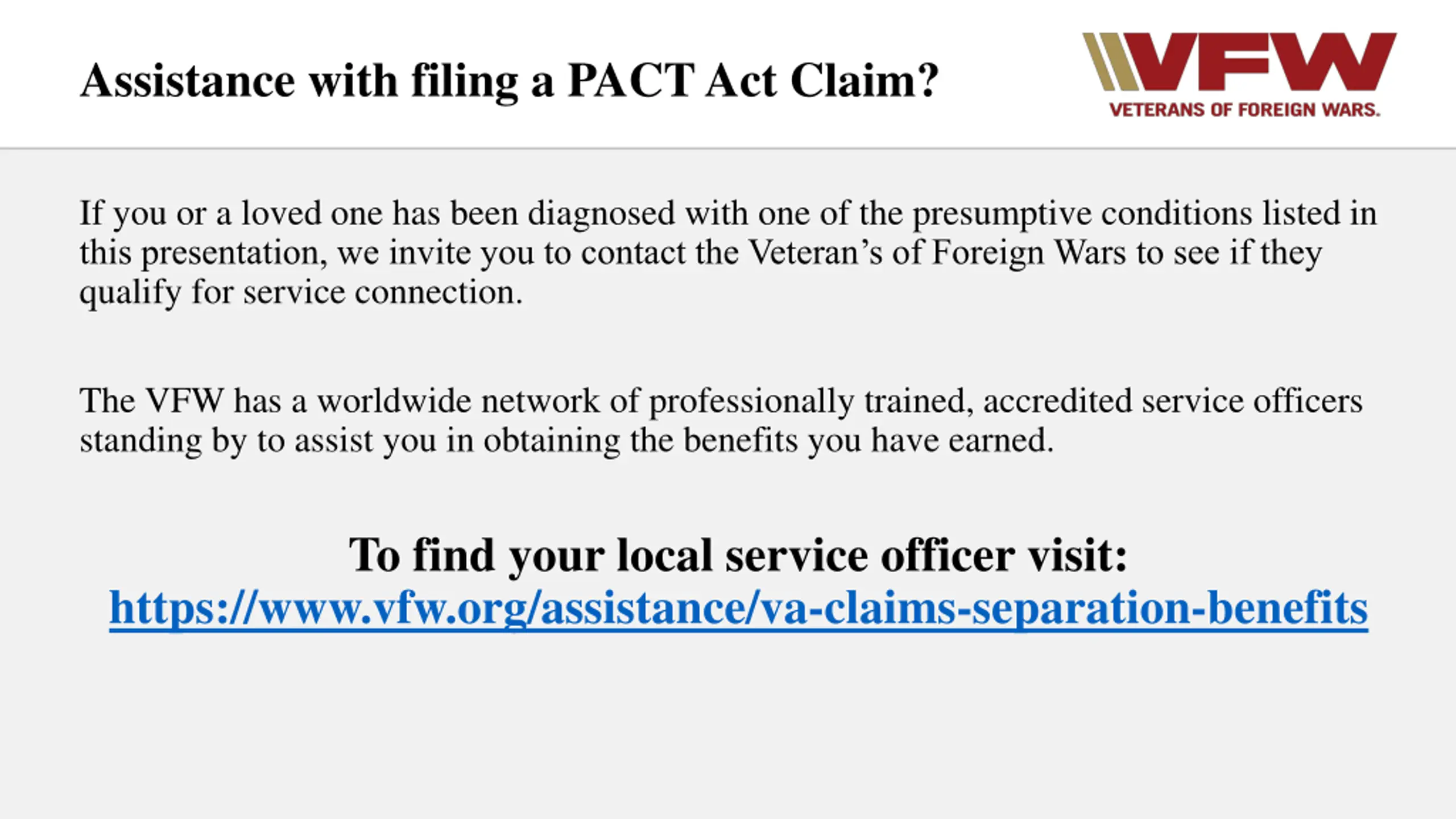 Assistance with filing a PACT Act Claim? If you or a loved one has been diagnosed with one of the presumptive conditions listed in this presentation, we invite you to contact the Veteran s of Foreign Wars to see if they qualify for service connection. The VFW has a worldwide network of professionally trained, accredited service officers standing by to assist you in obtaining the benefits you have earned. To find your local service officer visit: https://www.vfw.org/assistance/va-claims-separation-benefits