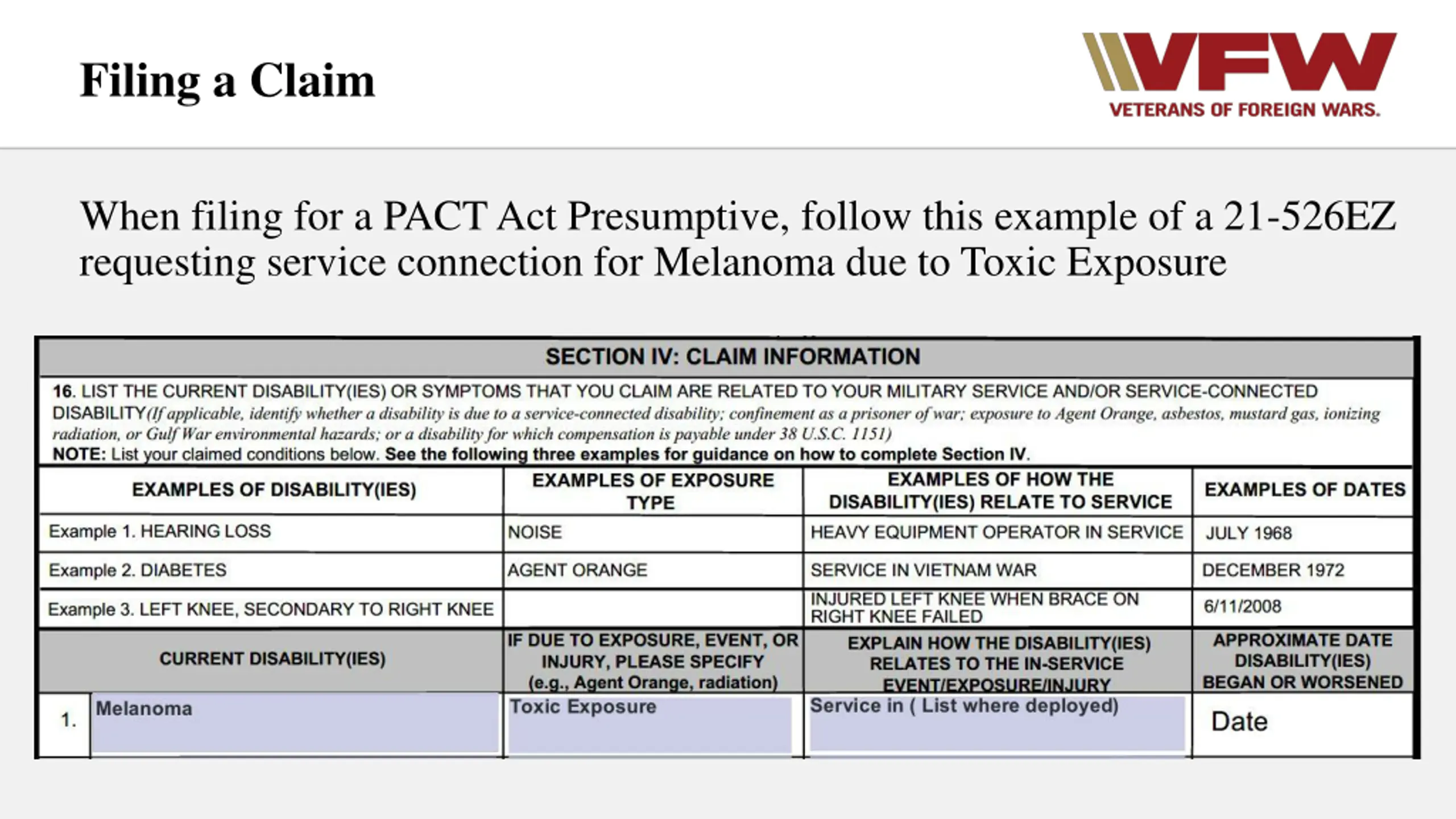 Filing a Claim When filing for a PACT Act Presumptive, follow this example of a 21-526EZ requesting service connection for Melanoma due to Toxic Exposure