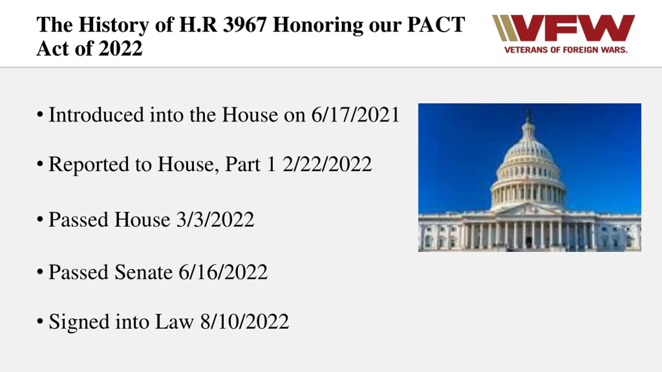 The History of H.R 3967 Honoring our PACT Act of 2022 Introduced into the House on 6/17/2021 Reported to House, Part 1 2/22/2022 Passed House 3/3/2022 Passed Senate 6/16/2022 Signed into Law 8/10/2022
