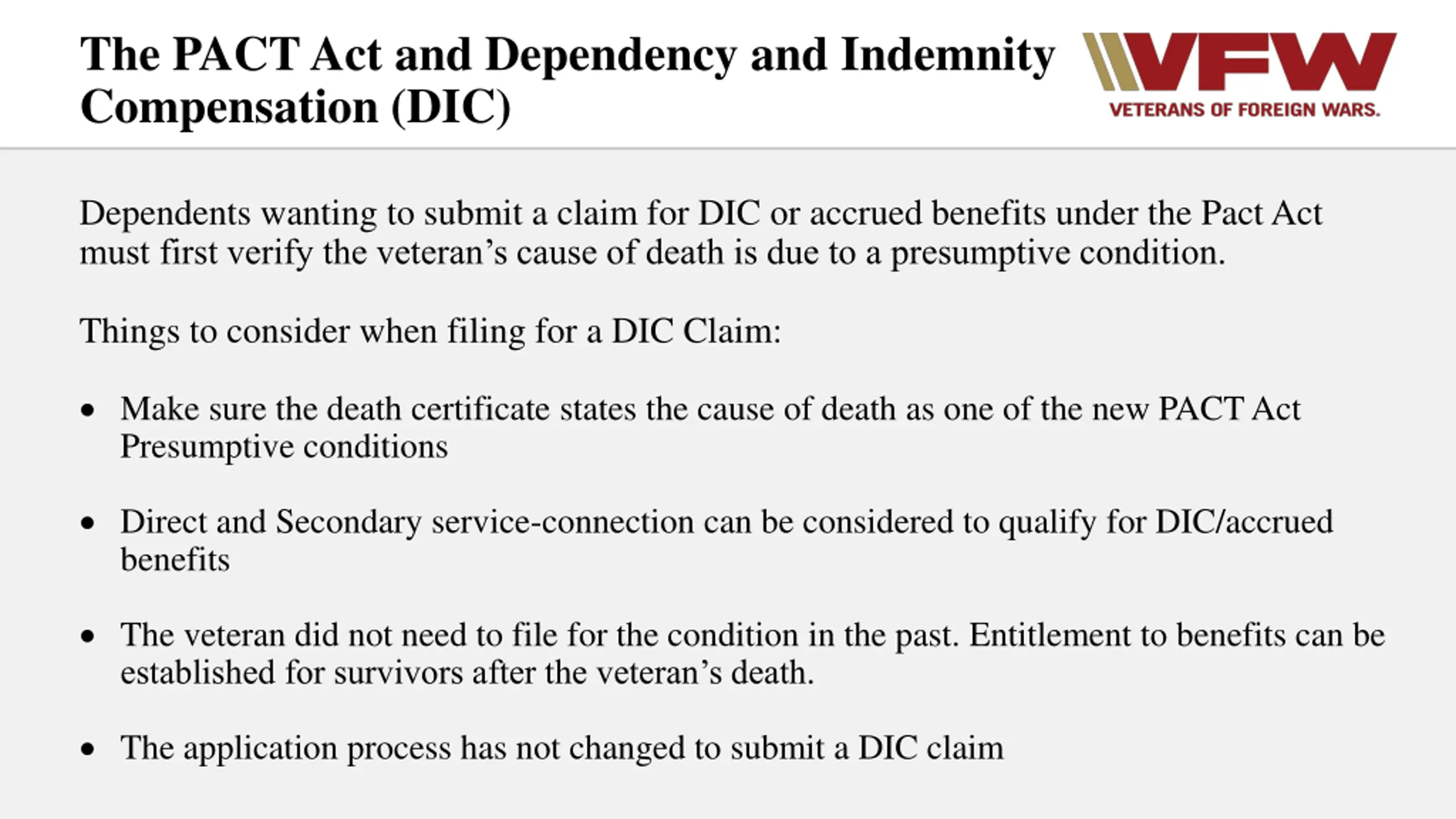 The PACT Act and Dependency and Indemnity Compensation (DIC) Dependents wanting to submit a claim for DIC or accrued benefits under the Pact Act must first verify the veteran s cause of death is due to a presumptive condition. Things to consider when filing for a DIC Claim: Make sure the death certificate states the cause of death as one of the new PACT Act Presumptive conditions Direct and Secondary service-connection can be considered to qualify for DIC/accrued benefits The veteran did not need to file for the condition in the past. Entitlement to benefits can be established for survivors after the veteran s death. The application process has not changed to submit a DIC claim