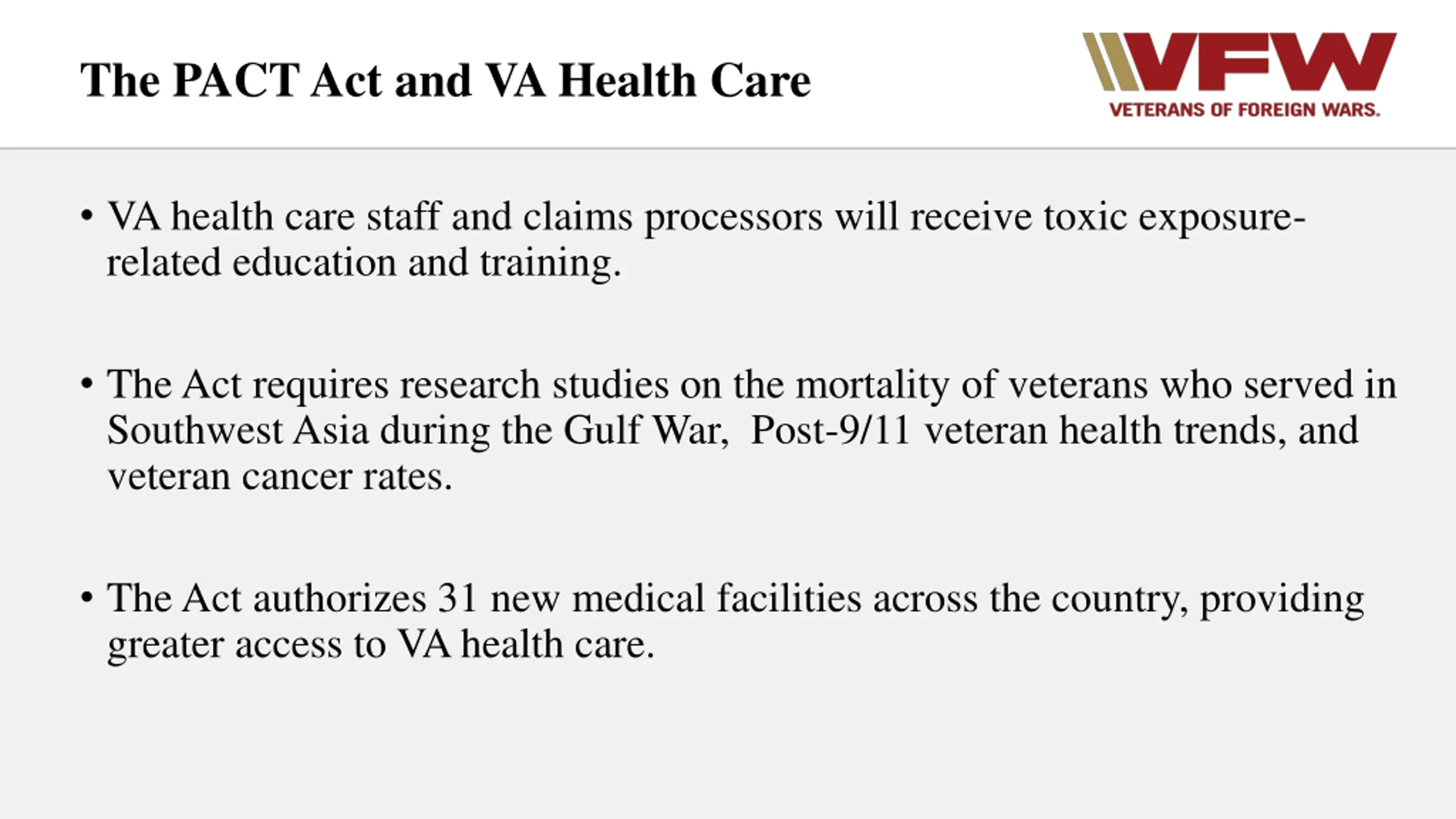 The PACT Act and VA Health Care VA health care staff and claims processors will receive toxic exposure- related education and training. The Act requires research studies on the mortality of veterans who served in Southwest Asia during the Gulf War, Post-9/11 veteran health trends, and veteran cancer rates. The Act authorizes 31 new medical facilities across the country, providing greater access to VA health care.
