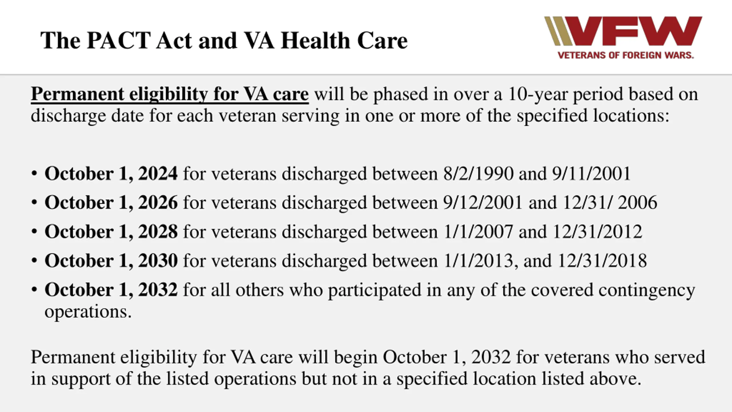 The PACT Act and VA Health Care Permanent eligibility for VA care will be phased in over a 10-year period based on discharge date for each veteran serving in one or more of the specified locations: October 1, 2024 for veterans discharged between 8/2/1990 and 9/11/2001 October 1, 2026 for veterans discharged between 9/12/2001 and 12/31/ 2006 October 1, 2028 for veterans discharged between 1/1/2007 and 12/31/2012 October 1, 2030 for veterans discharged between 1/1/2013, and 12/31/2018 October 1, 2032 for all others who participated in any of the covered contingency operations. Permanent eligibility for VA care will begin October 1, 2032 for veterans who served in support of the listed operations but not in a specified location listed above.