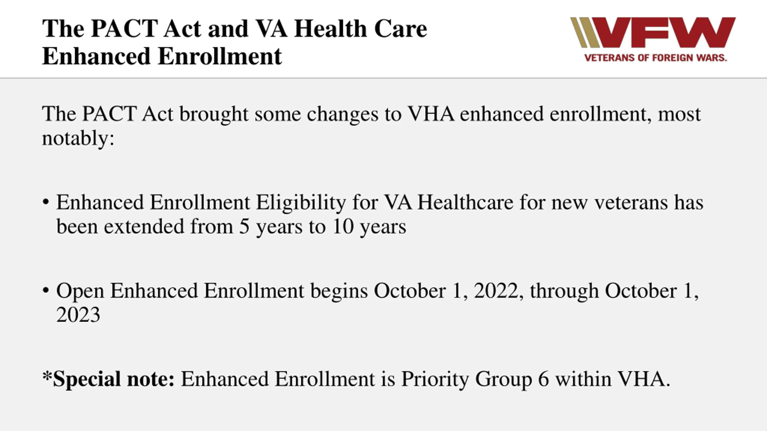 The PACT Act and VA Health Care Enhanced Enrollment The PACT Act brought some changes to VHA enhanced enrollment, most notably: Enhanced Enrollment Eligibility for VA Healthcare for new veterans has been extended from 5 years to 10 years Open Enhanced Enrollment begins October 1, 2022, through October 1, 2023 *Special note: Enhanced Enrollment is Priority Group 6 within VHA.