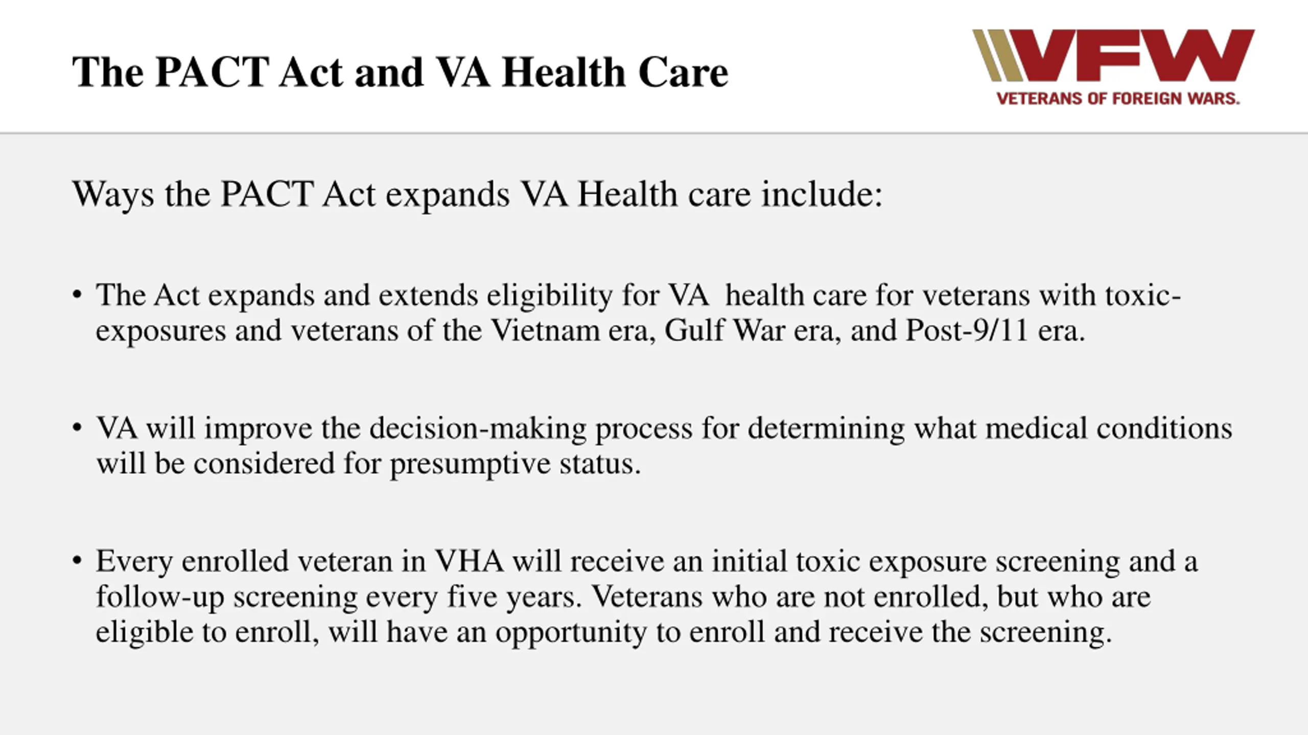 The PACT Act and VA Health Care Ways the PACT Act expands VA Health care include: The Act expands and extends eligibility for VA health care for veterans with toxic- exposures and veterans of the Vietnam era, Gulf War era, and Post-9/11 era. VA will improve the decision-making process for determining what medical conditions will be considered for presumptive status. Every enrolled veteran in VHA will receive an initial toxic exposure screening and a follow-up screening every five years. Veterans who are not enrolled, but who are eligible to enroll, will have an opportunity to enroll and receive the screening.